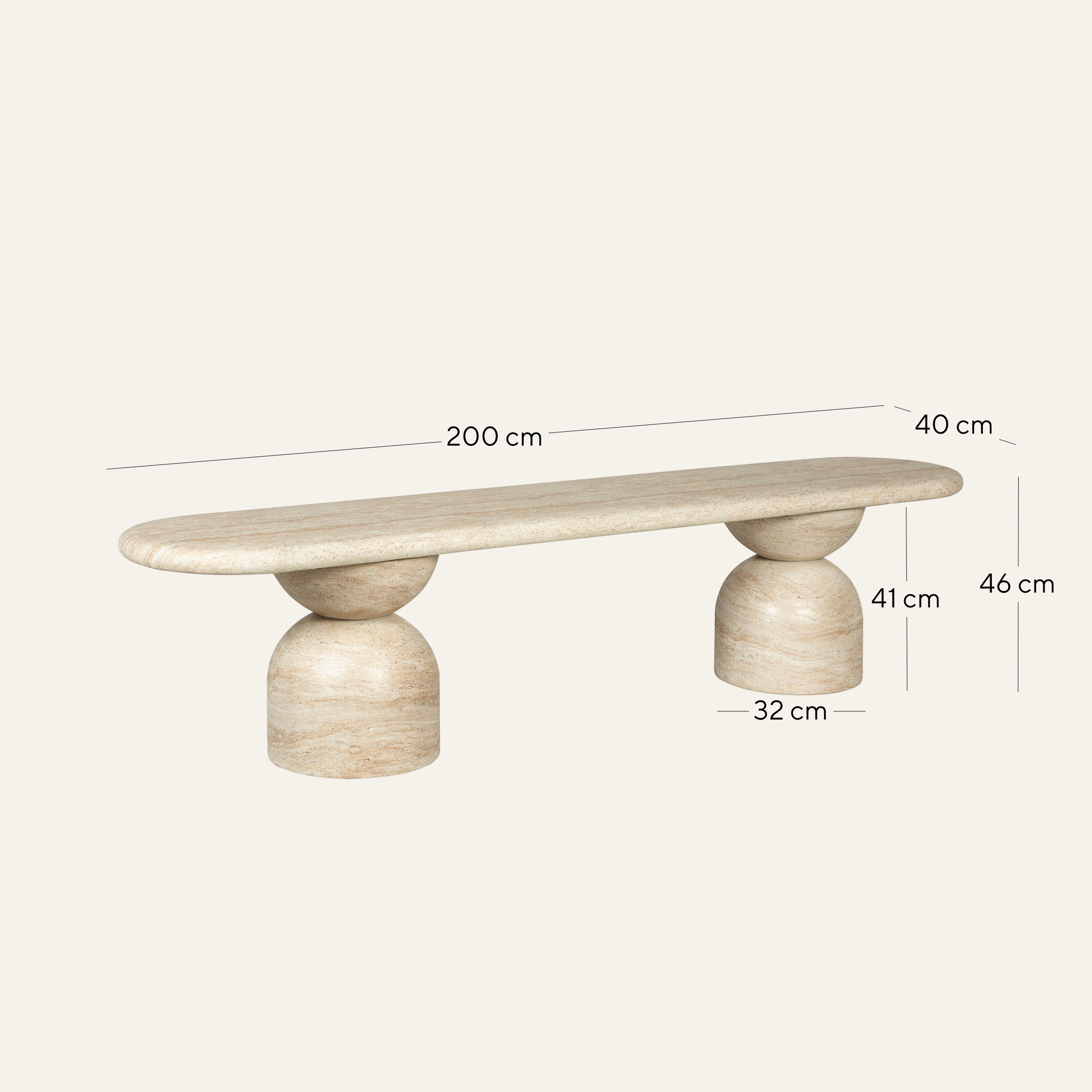 Overall: 200cm (W) x 40cm (D) x 46cm (H) Table Thickness: 5cm Base: 32cm (D) x 41cm (H)