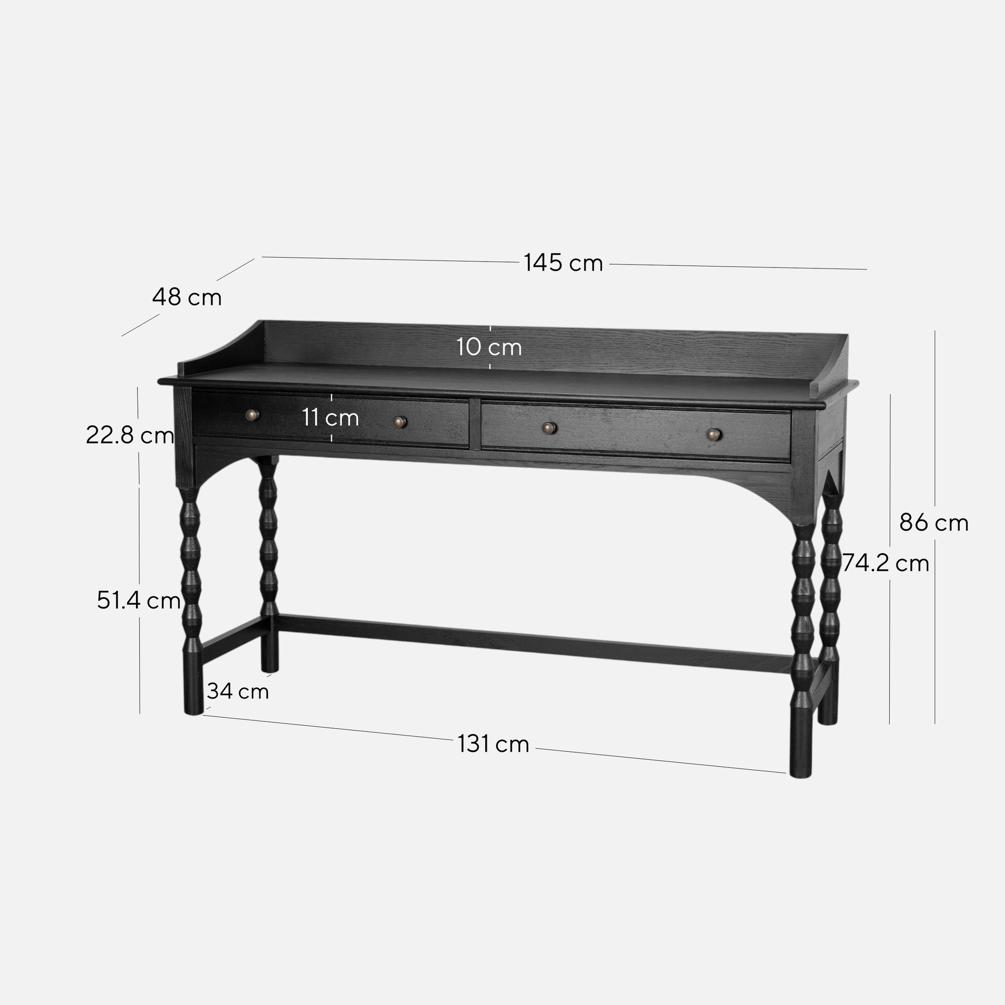 - Two compact drawers with elegant metal knobs