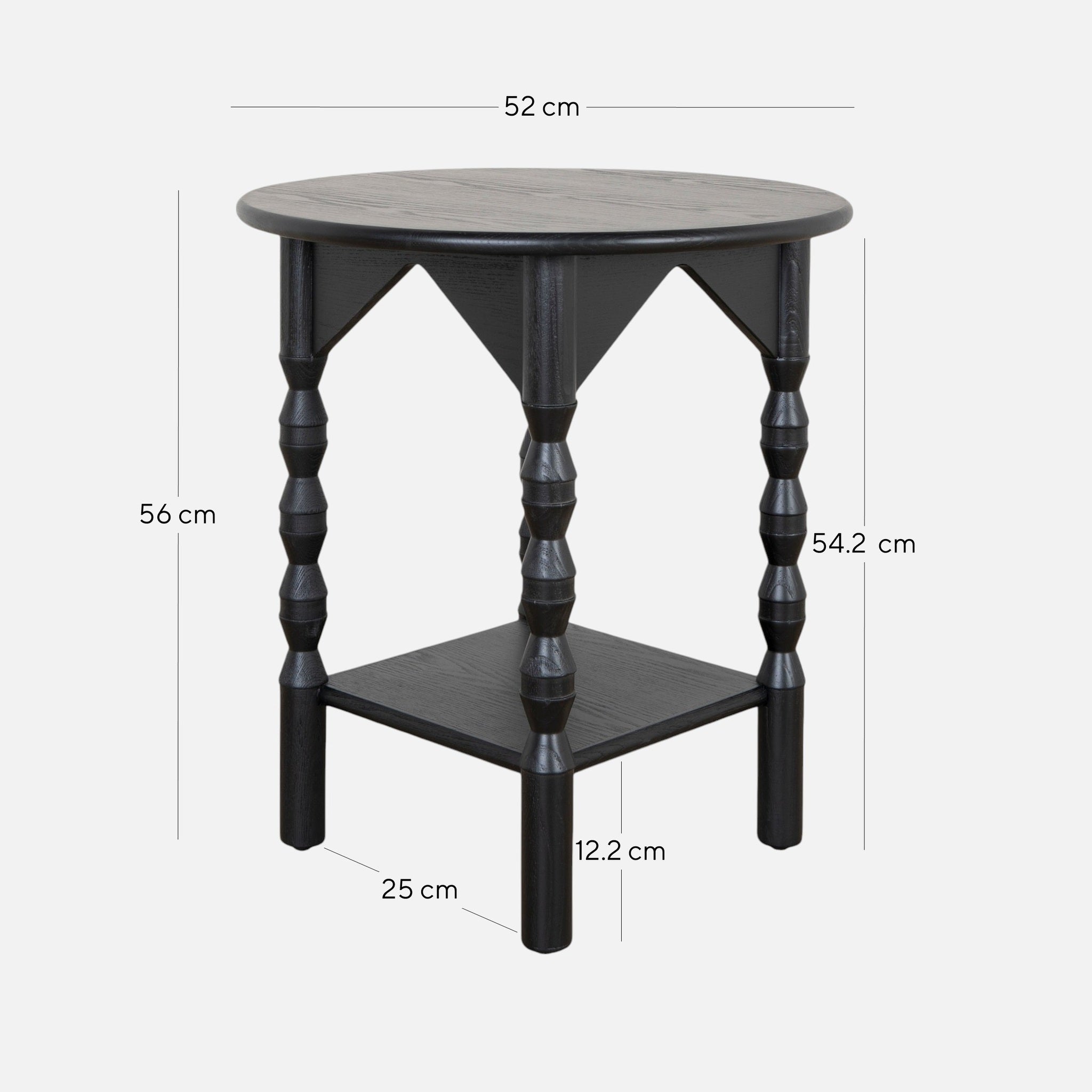Overall: 52cm (W) x 52cm (D) x 56cm (H) Table Hanging: 9.5cm Leg Height: 54.2cm Shelf to Base Height: 12.2cm Distance between Legs: 25cm