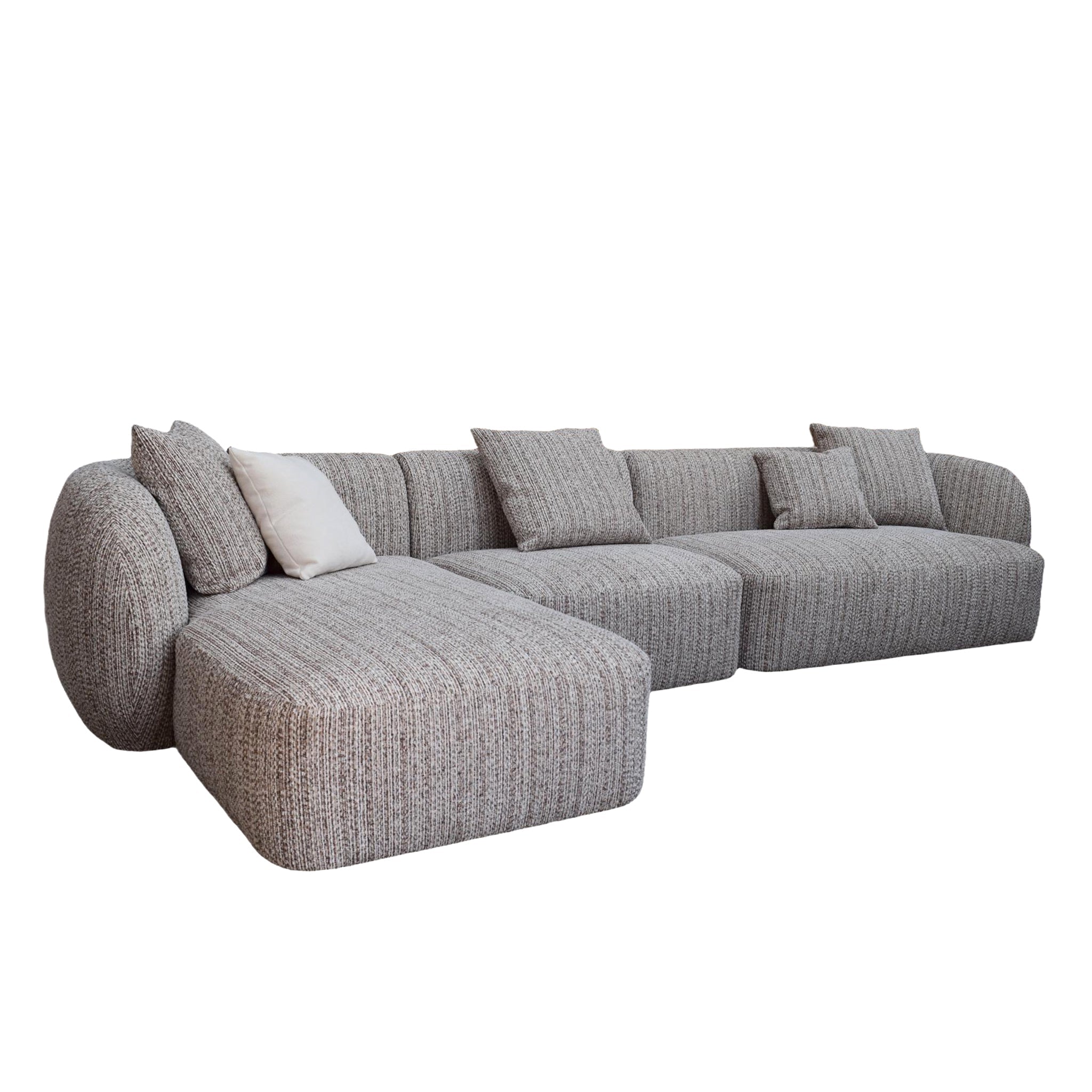 Defined by flowing lines and a sculptural profile, the Ravello 4 Seater Left Chaise Sofa in Plush Spec Brown balances contemporary design with everyday ease. Its curved silhouette creates visual softness, while the spacious chaise offers a welcoming place to stretch out and unwind.