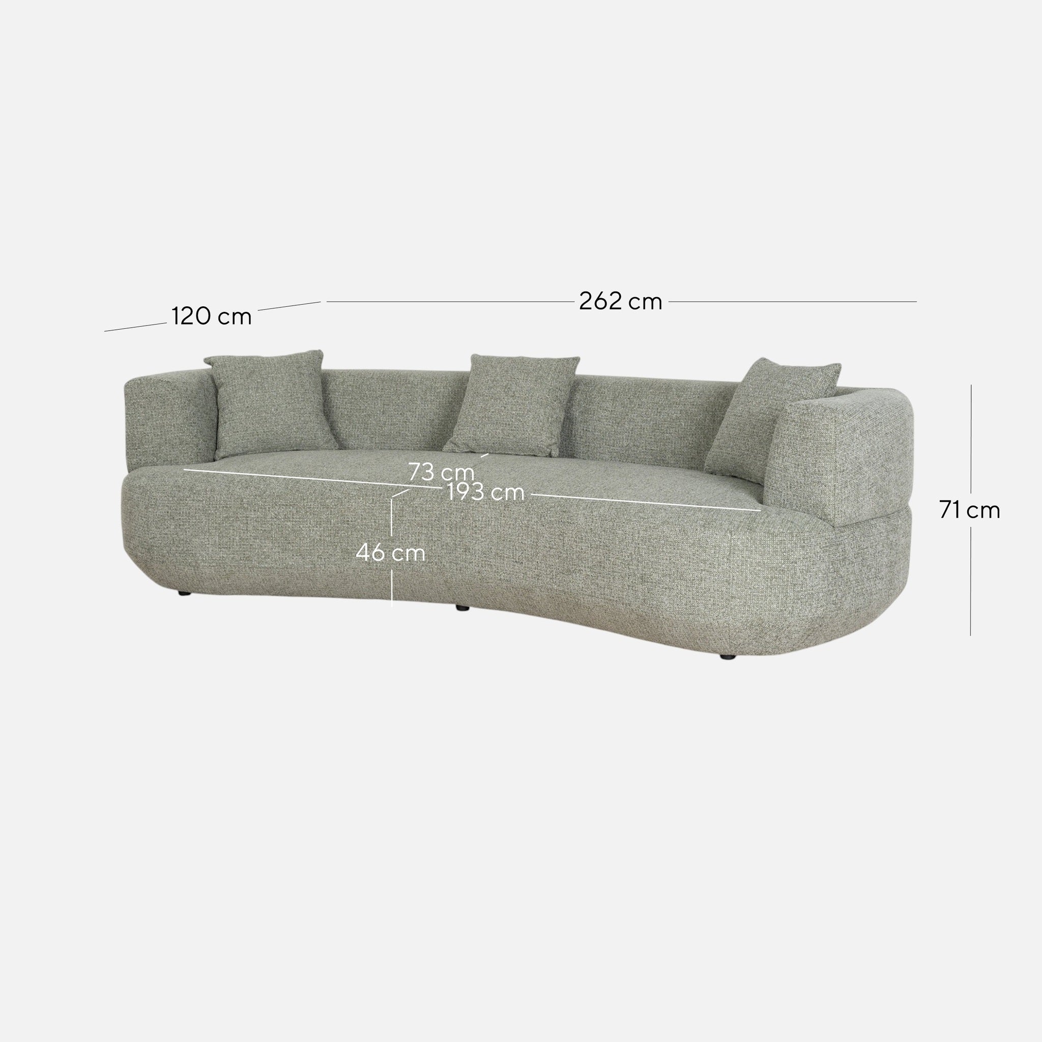 Overall: 262cm (W) x 120cm (D) x 71cm (H) Seat: 193cm (W) x 73cm (D) x 46cm (H) Arm Height: 70cm Leg Height: 3cm