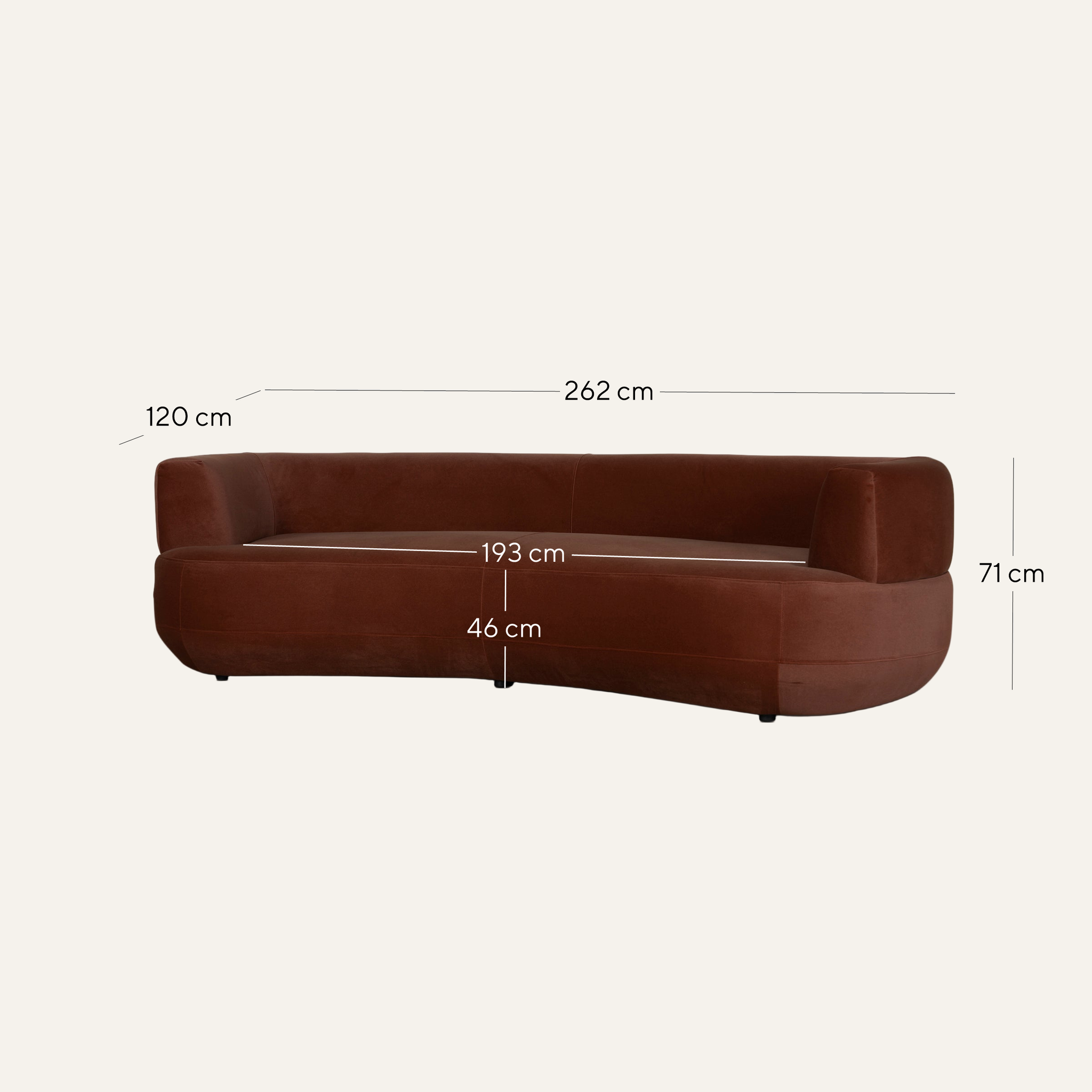 Overall: 262cm (W) x 120cm (D) x 71cm (H) Seat: 193cm (W) x 73cm (D) x 46cm (H) Arm Height: 70cm Leg Height: 3cm