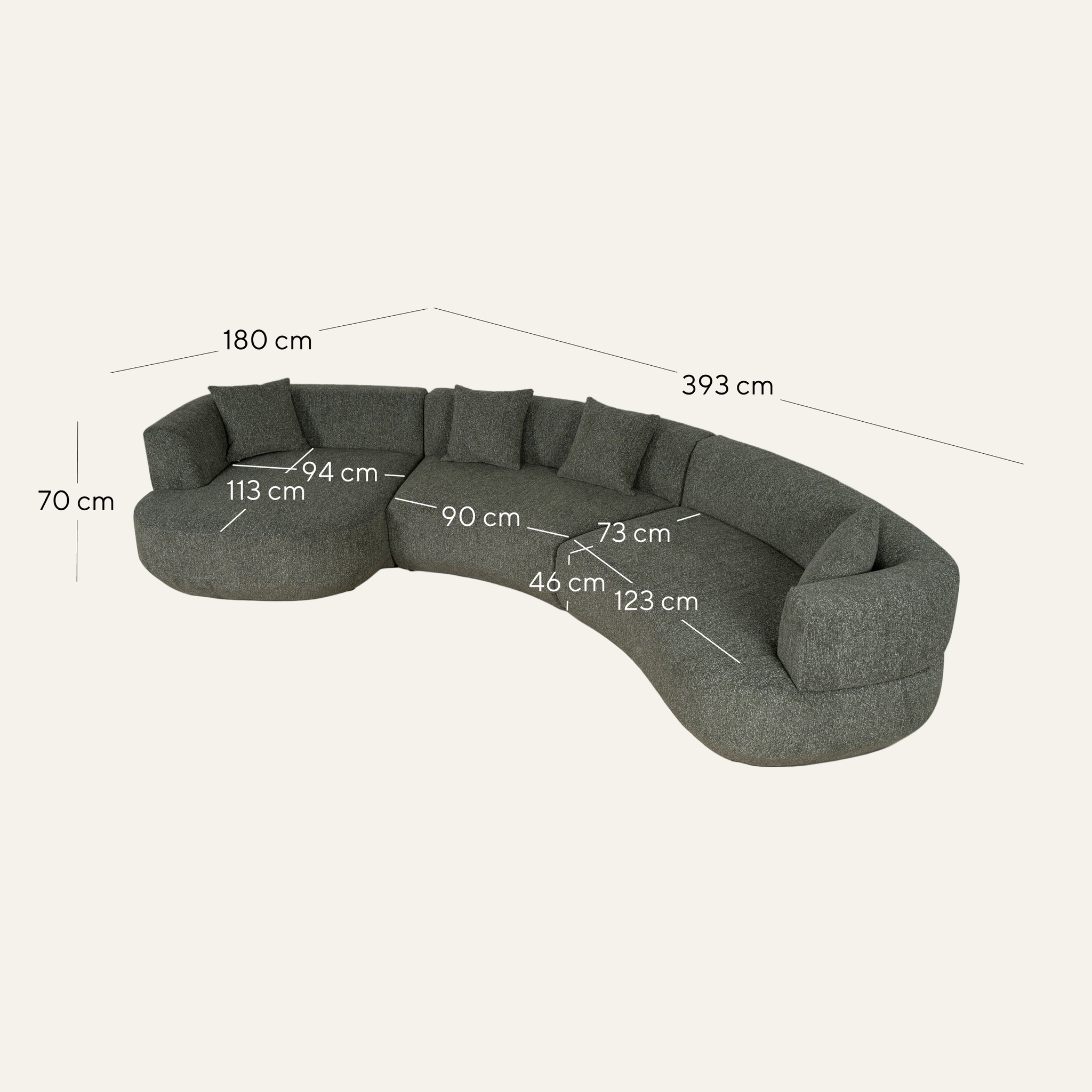 Overall: 393cm (W) x 180cm (D) x 70cm (H) Sofa Arm: 123cm (W) x 73cm (D) x 46cm (H) Corner: 90cm (W) x 73cm (D) x 46cm (H) Chaise: 94cm (W) x 113cm (D) x 46cm (H) Arm Height: 70cm Leg Height: 3cm