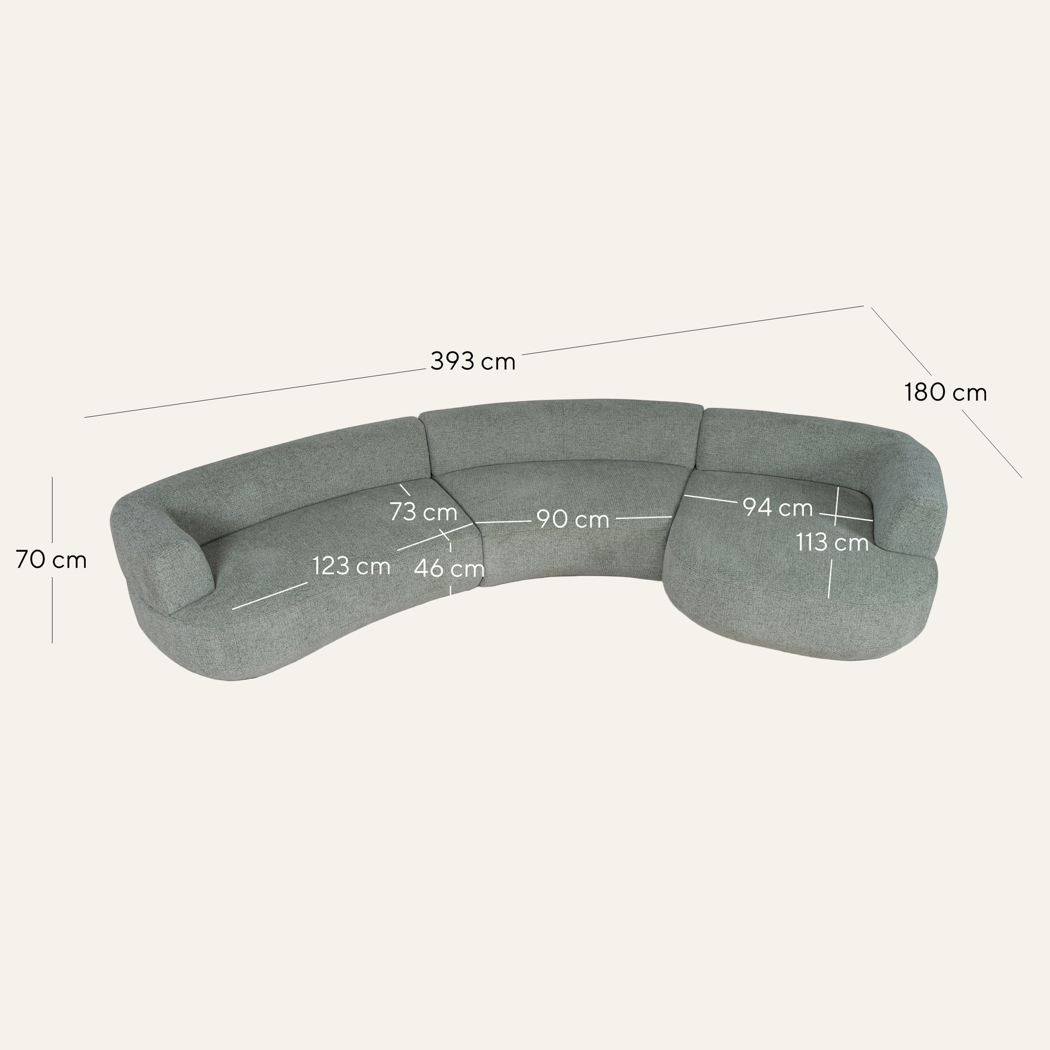 Overall: 393cm (W) x 180cm (D) x 70cm (H) Arm sofa: 123cm (W) x 73cm (D) x 46cm (H) Corner: 90cm (W) x 73cm (D) x 46cm (H) Chaise: 94cm (W) x 113cm (D) x 46cm (H) Arm Height: 70cm Leg Height: 3cm
