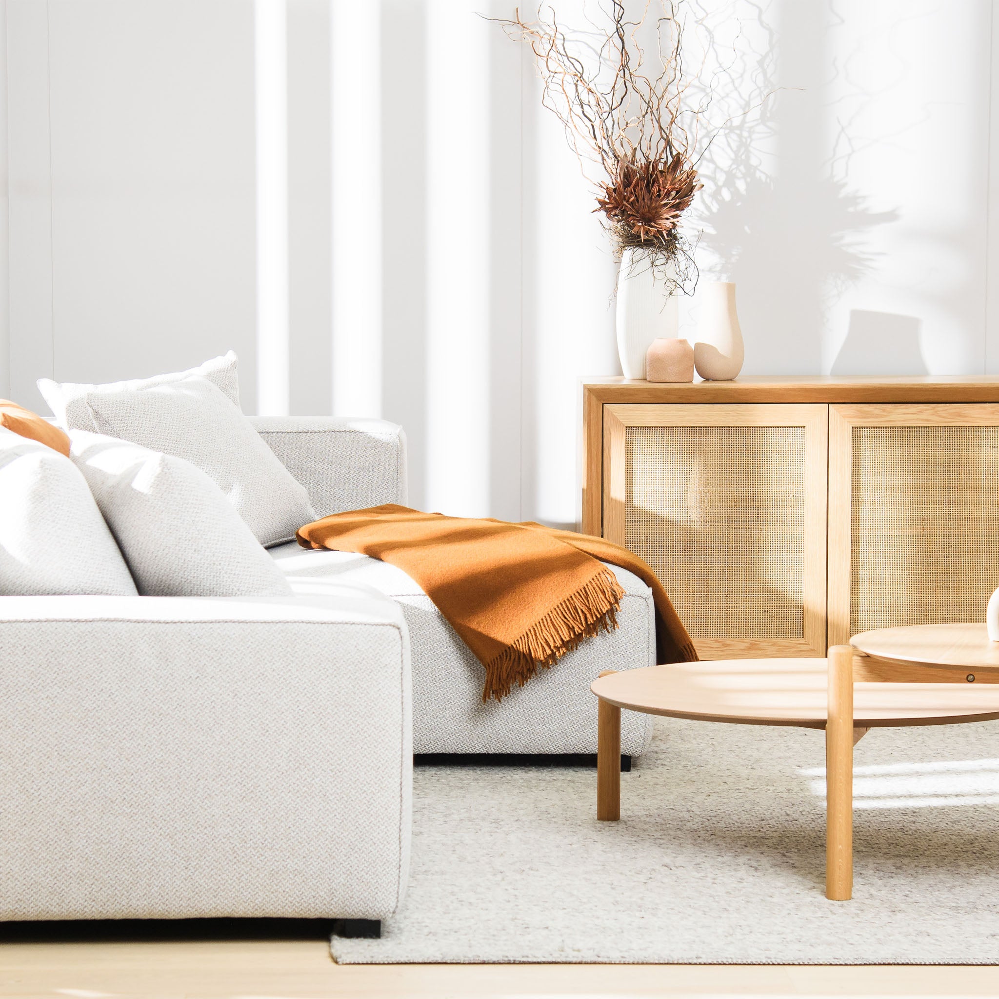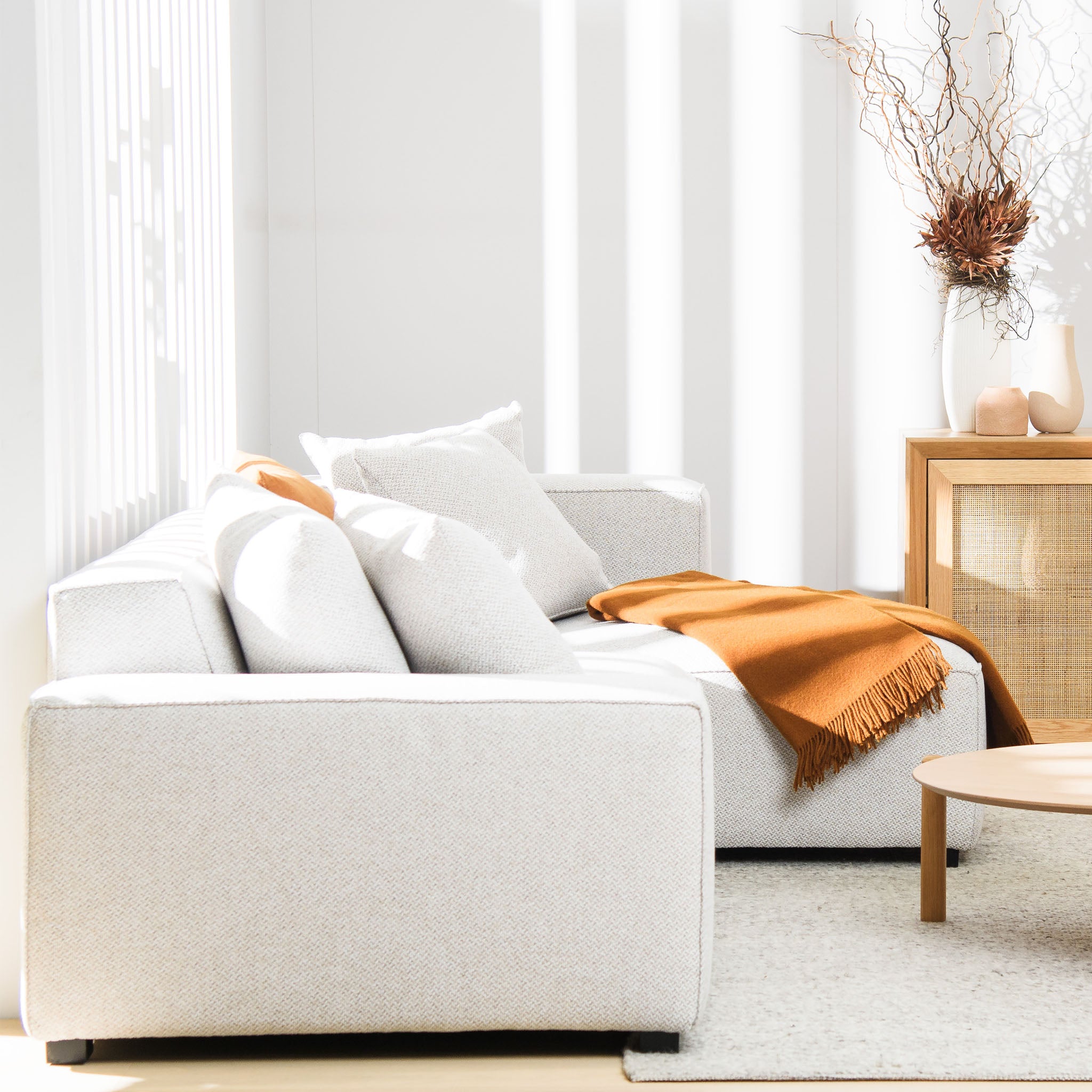 Unwind in style on the Roshil Right Chaise Fabric Sofa, draped in a chic fog grey fabric, offering a cosy seat, and featuring a sleek silhouette that complements any modern living space.