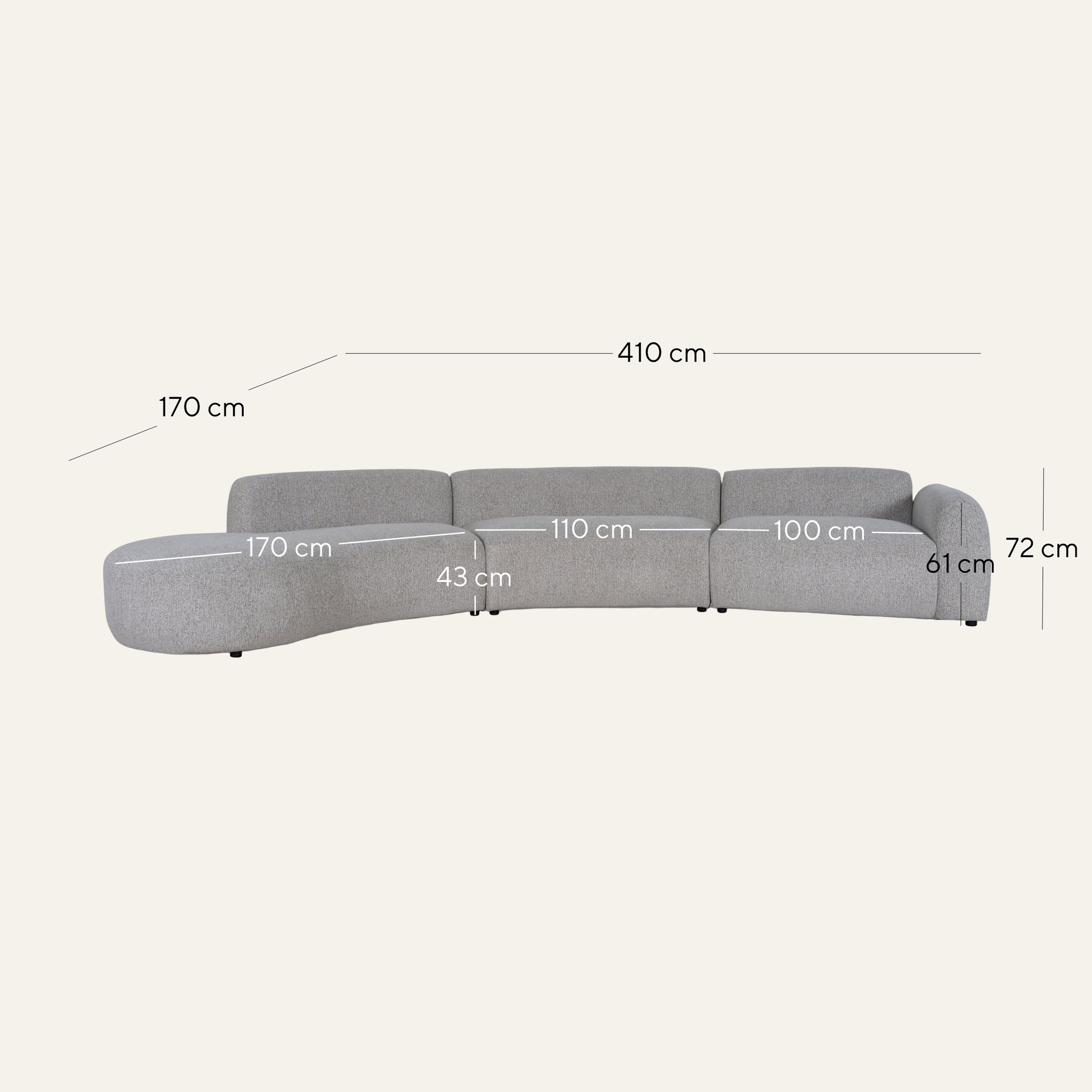 Overall: 410cm (W) x 170cm (D) x 72cm (H) Right arm: 100cm (W) x 72cm (D) x 43cm (H) Corner: 110cm (W) x 72cm (D) x 43cm (H) Chaise: 170cm (W) x 72cm (D) x 43cm (H) Arm Height: 61cm Leg Height: 3cm