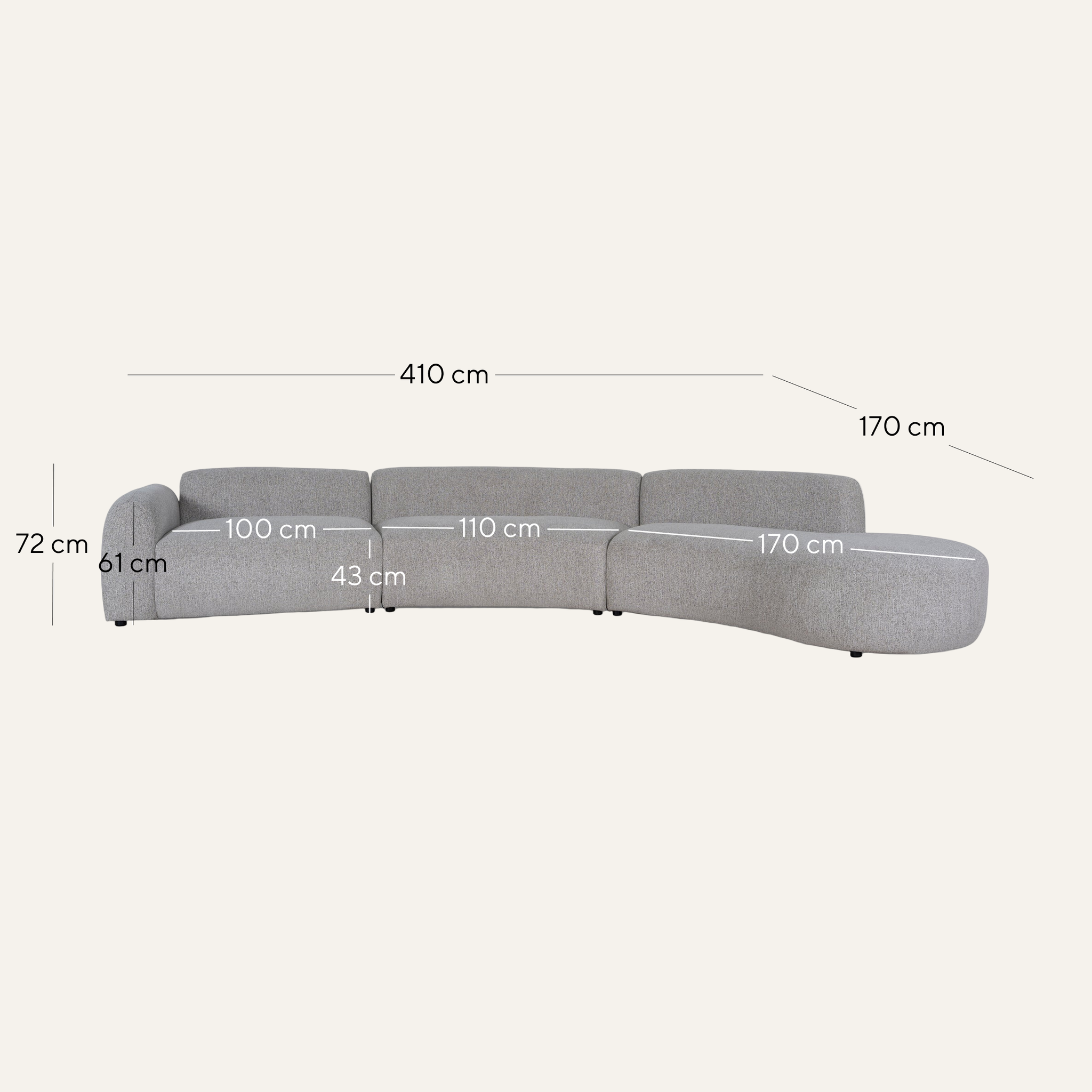 Overall: 410cm (W) x 170cm (D) x 72cm (H) Left arm: 100cm (W) x 72cm (D) x 43cm (H) Corner: 110cm (W) x 72cm (D) x 43cm (H) Chaise: 170cm (W) x 72cm (D) x 43cm (H) Arm Height: 61cm Leg Height: 3cm
