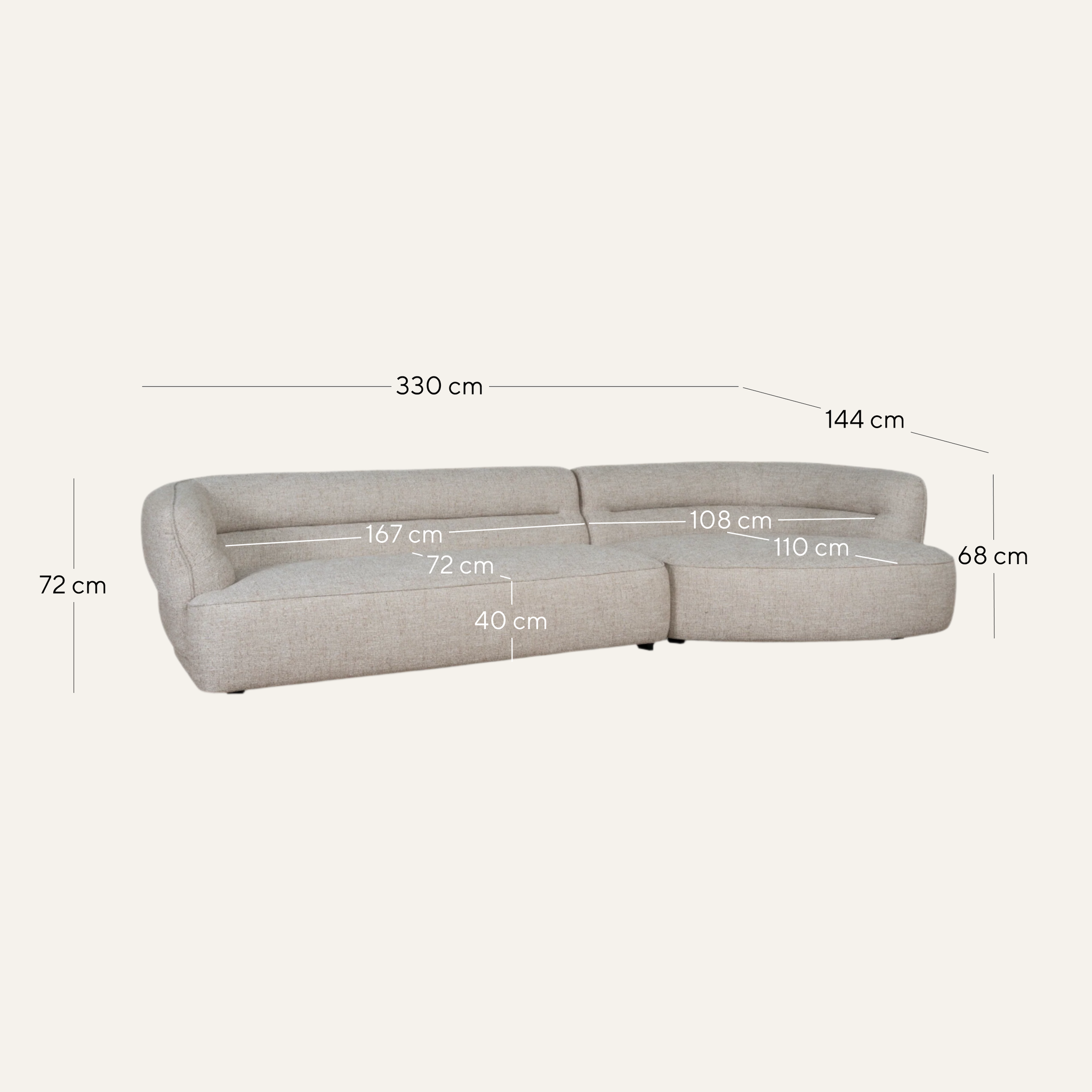 Overall: 330cm (W) x 144cm (D) x 72cm (H) Sofa Seat: 167cm (W) x 72cm (D) x 40cm (H) Chase Seat: 108cm (W) x 110cm (D) x 40cm (H) Arm Height: 68cm Leg Height: 5cm