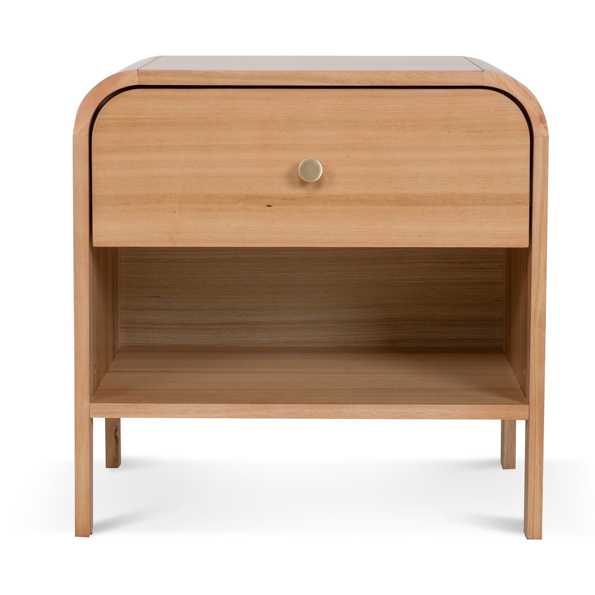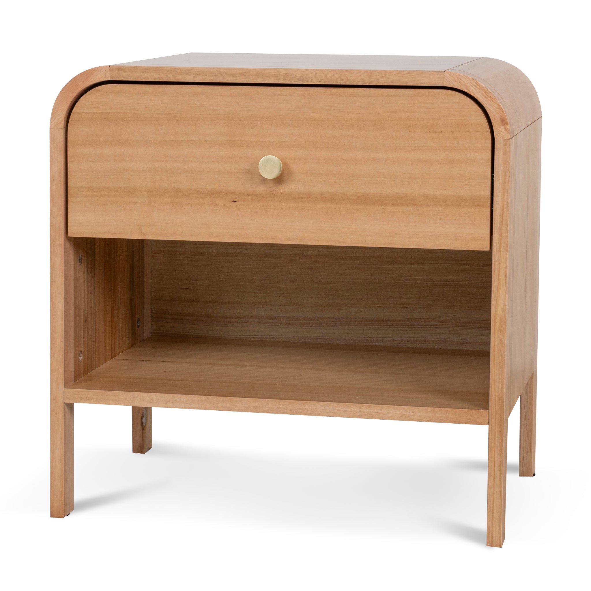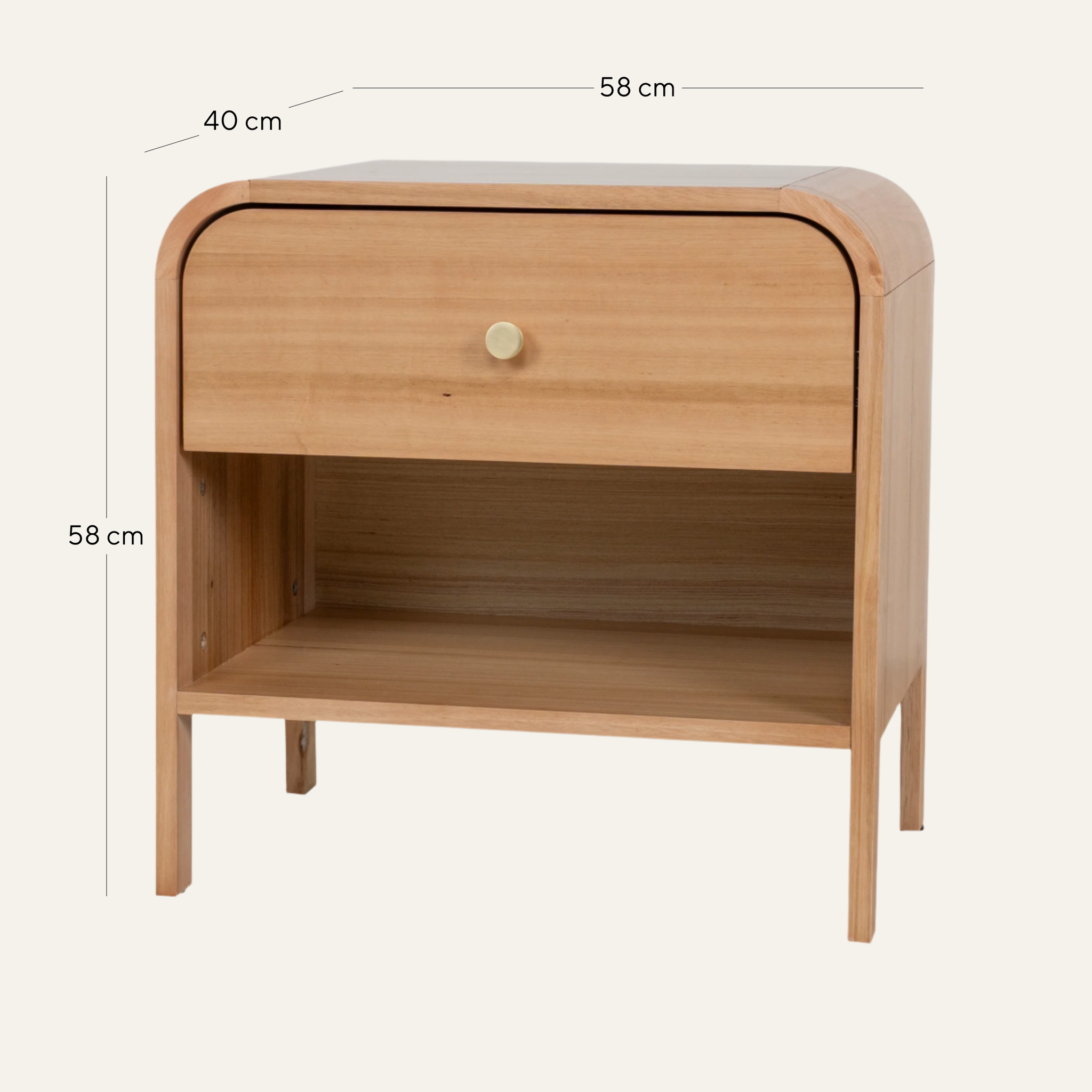The Serene 58cm Bedside Table in Messmate captures the essence of minimal design with a gentle, curved silhouette and soft edges that add a calming presence to any bedroom. Its clean, uninterrupted lines and balanced proportions make it a perfect companion for modern and Scandinavian interiors.
