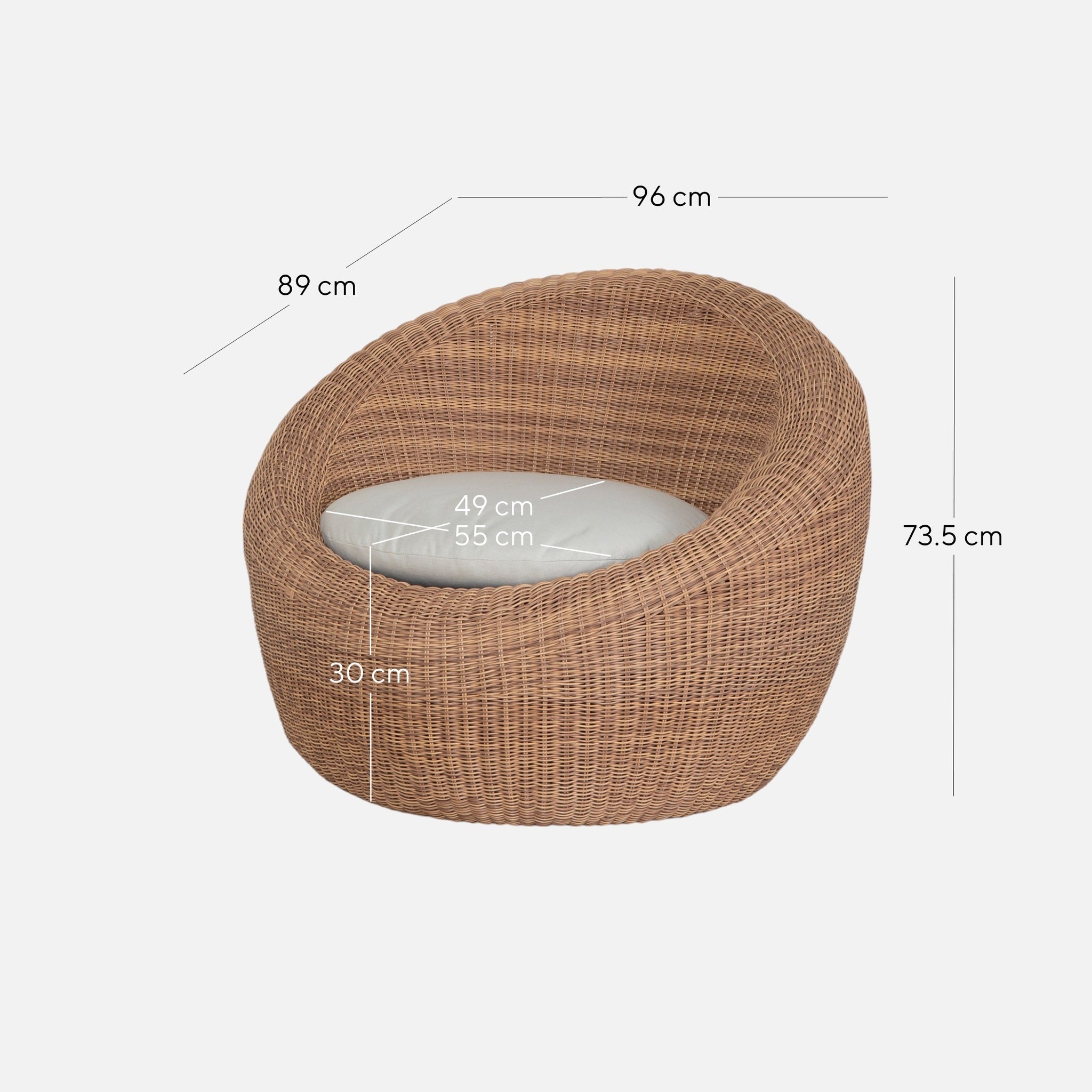 Overall: 96cm (W) x 89cm (D) x 73.5cm (H) Seat: 55cm (W) x 49cm (D) x 30cm (H)