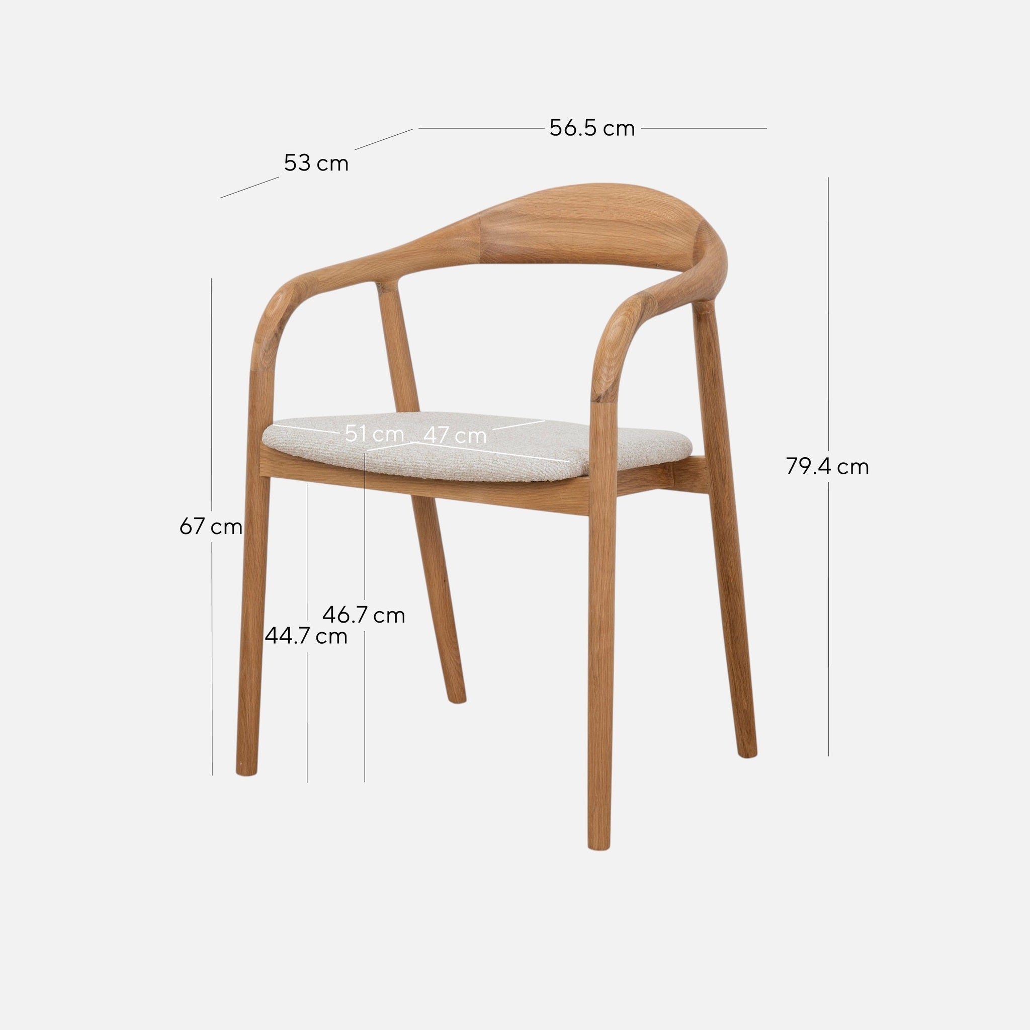 Overall: 56.5cm (W) x 53cm (D) x 79.4cm (H) Seat: 51cm (W) x 47cm (D) x 46.7cm (H) Arm Height: 67cm Leg Height: 44.7cm