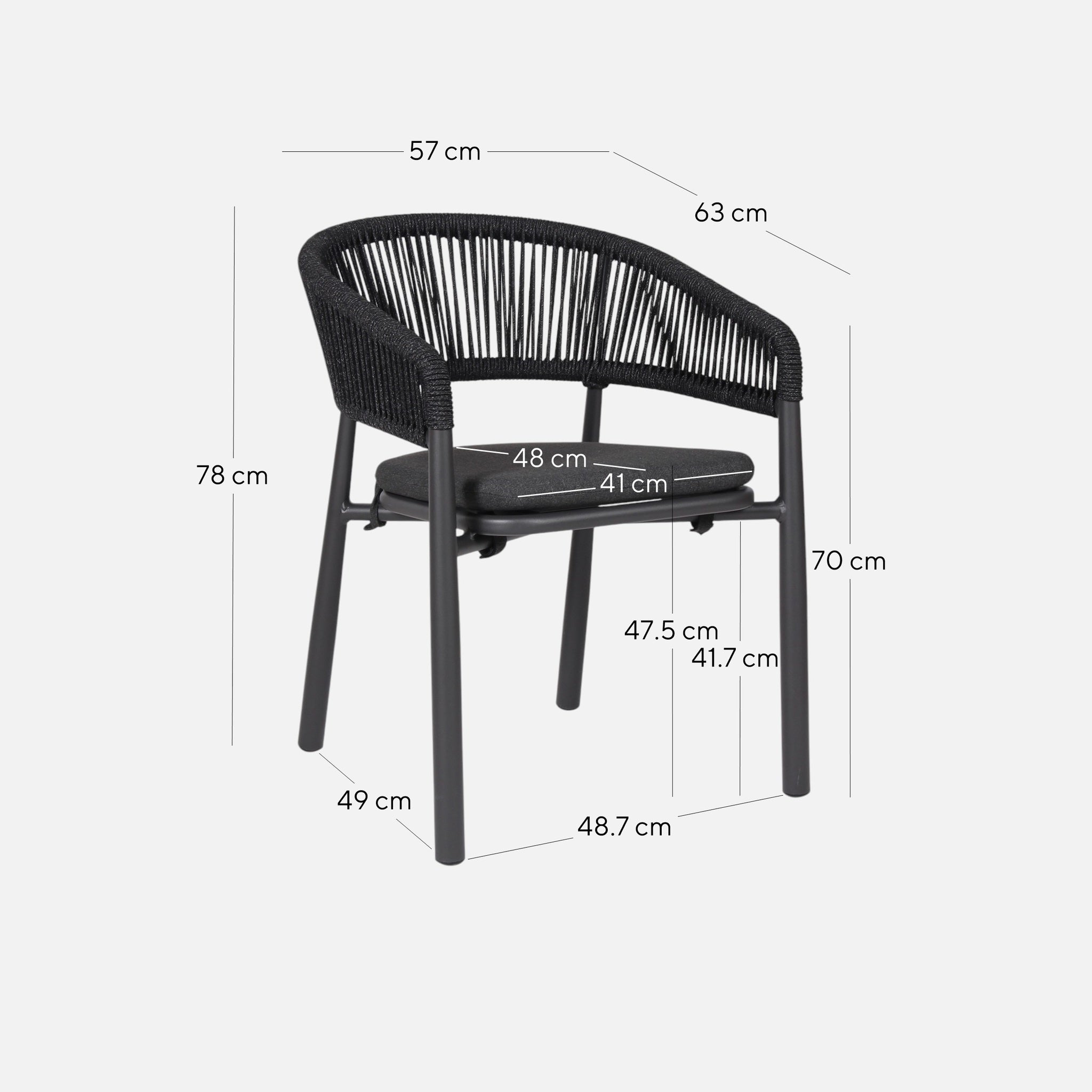 Overall: 57cm (W) x 63cm (D) x 78cm (H) Seat: 41cm (W) x 48cm (D) x 47.5cm (H) Backrest Height: 35cm Distance between Legs (Front): 48.7cm Distance between Legs (Side): 49cm Arm Height: 70cm Leg Height: 41.7cm