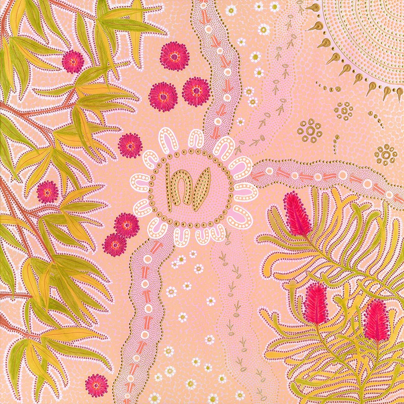 She Who Guides by Domica Hill showcases intricate dot patterns and vibrant botanical forms rooted in nature and storytelling. Warm pinks blend with bold reds and greens for striking visual impact. Framed and ready to hang.
