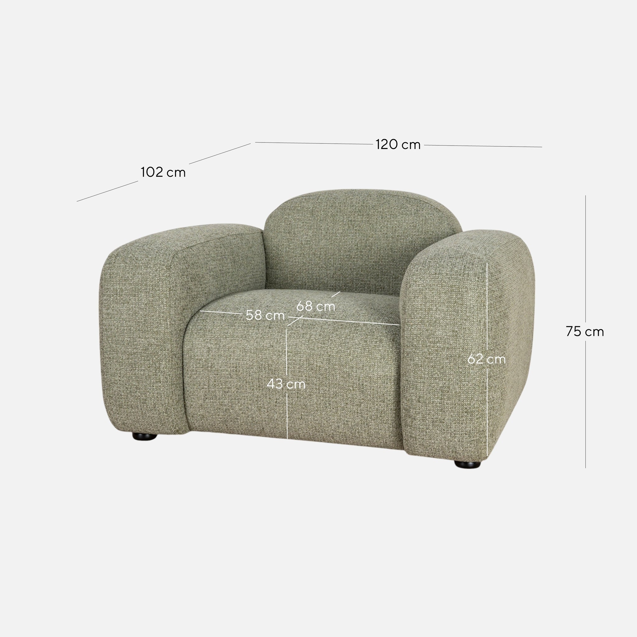 Overall: 120cm (W) x 102cm (D) x 75cm (H) Seat: 58cm (W) x 68cm (D) x 43cm (H) Arm Height: 62cm Leg Height: 3cm