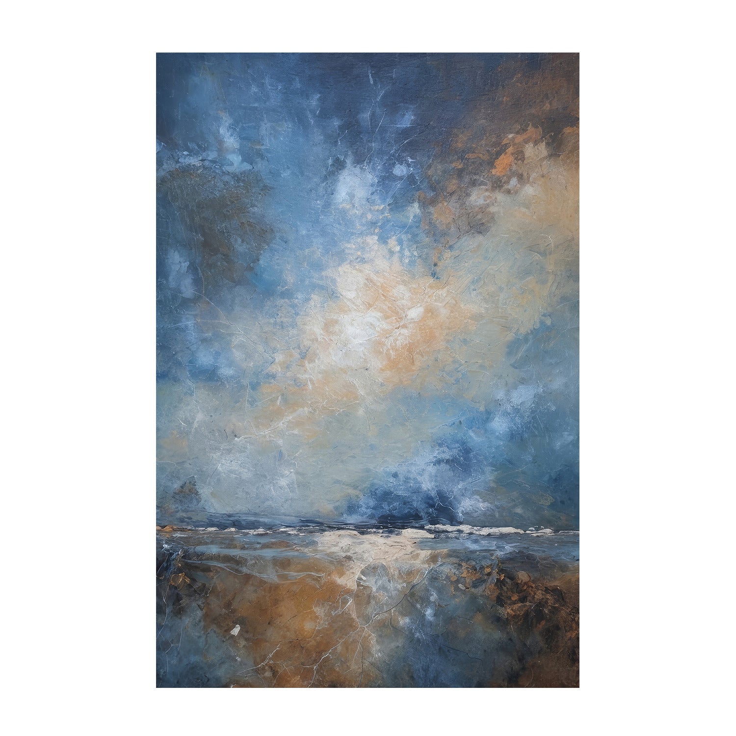 Introducing "Stormy Tides" by Alpenglow Workshop - a captivating coastal-themed painting with a dramatic sky and tranquil sea. The artist's masterful use of texture and color creates a sense of depth and movement, making this piece a perfect addition to any space in need of a touch of the coast.