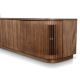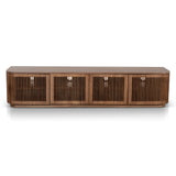 The Tahlia entertainment unit is designed to enhance your viewing experience by providing a stable and stylish platform for your TV and media devices. Its sleek design ensures that it does not overwhelm the space, while its rich walnut finish and innovative wood strip design add a touch of elegance.