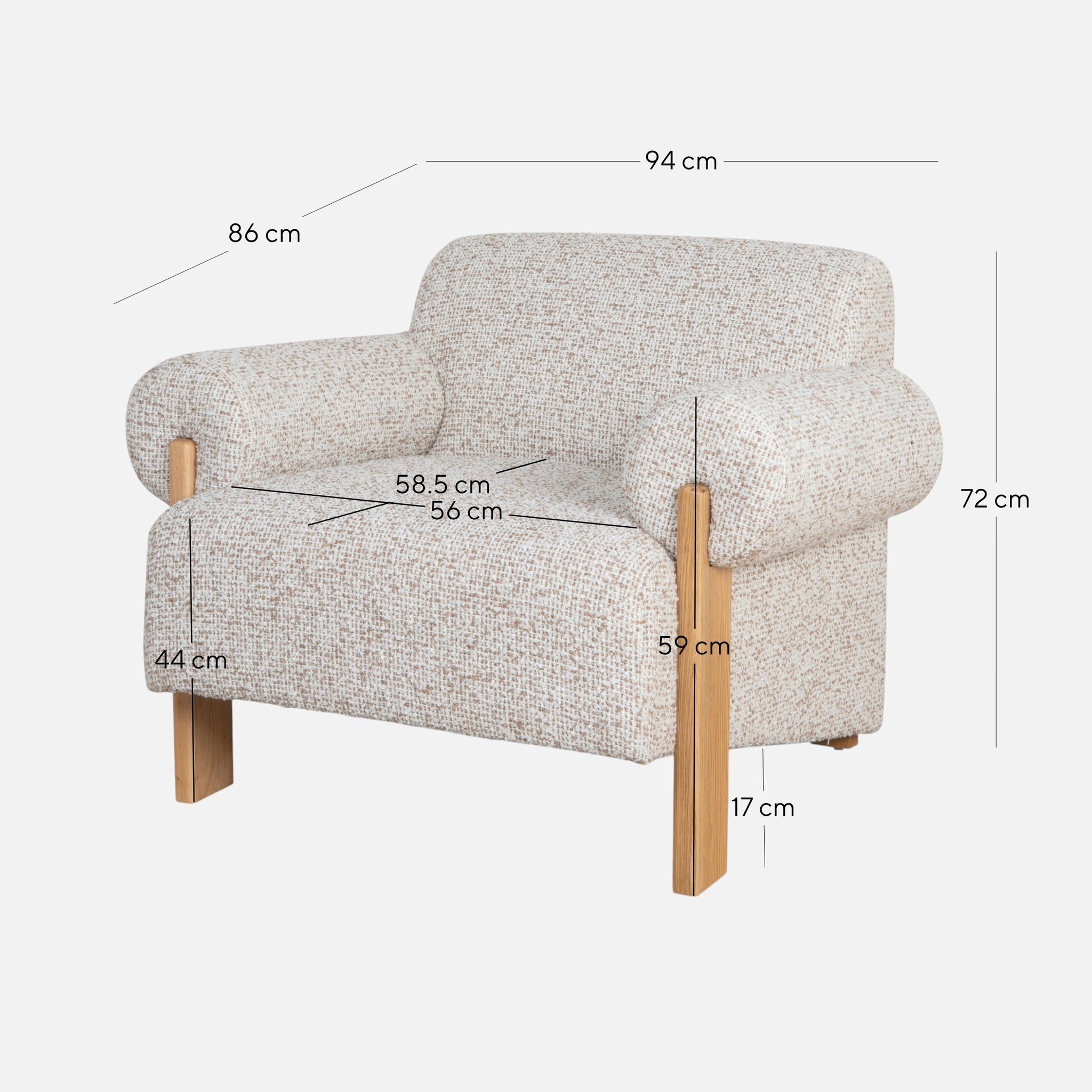Overall: 94cm (W) x 86cm (D) x 72cm (H) Seat: 56cm (W) x 58.5cm (D) x 44cm (H) Arm Height: 59cm Leg Height: 17cm