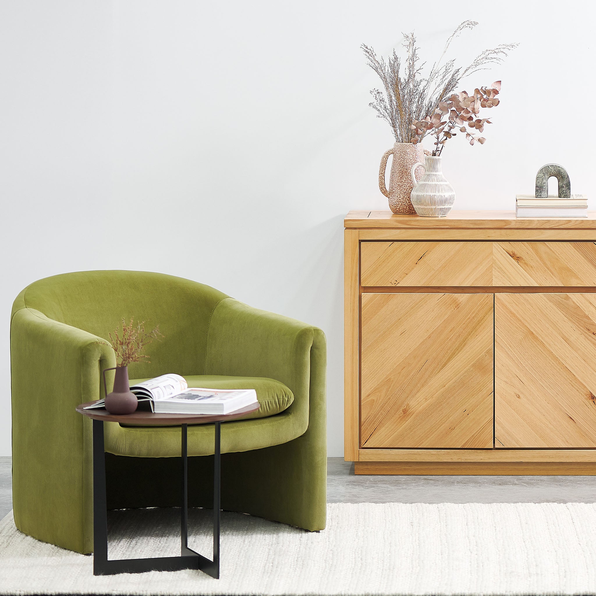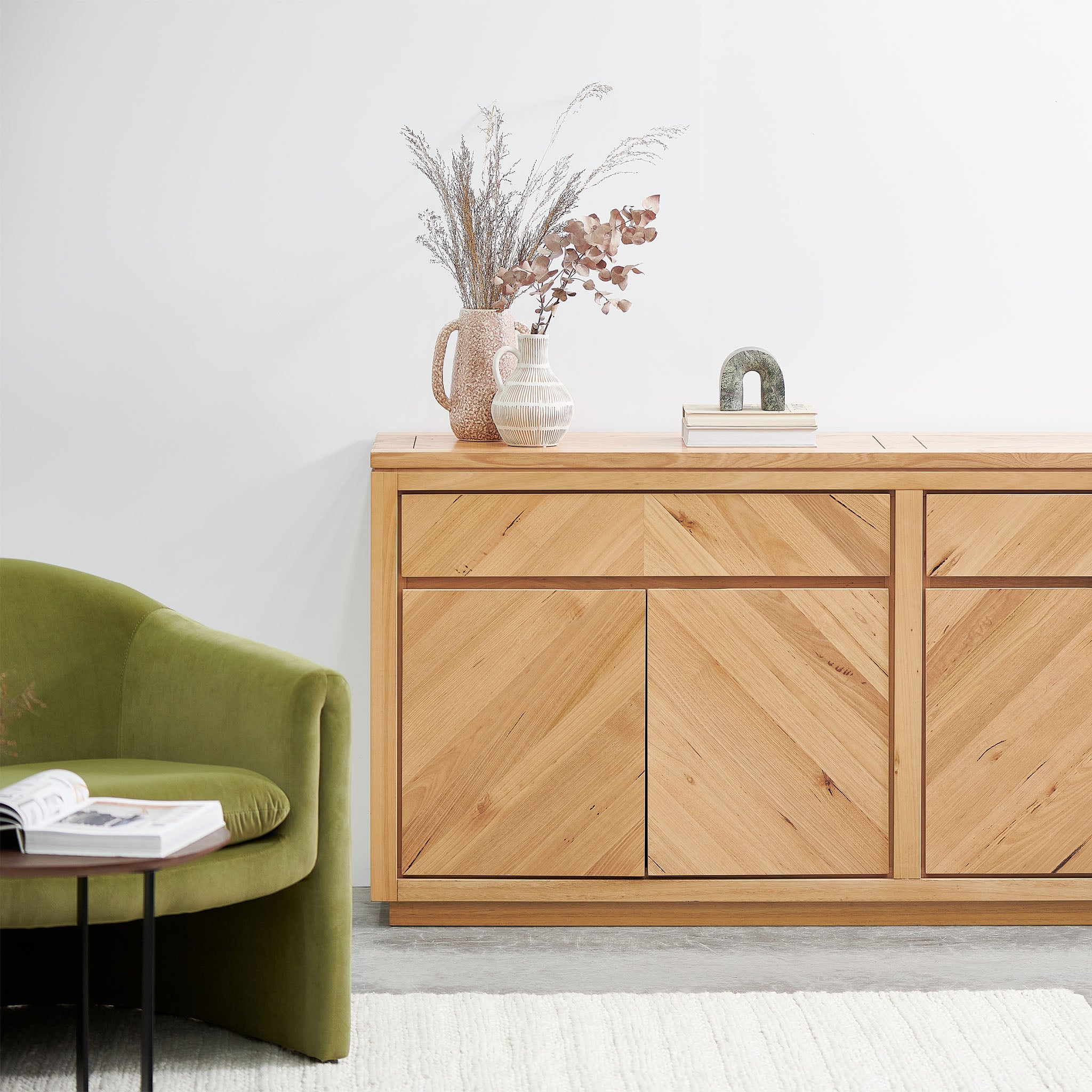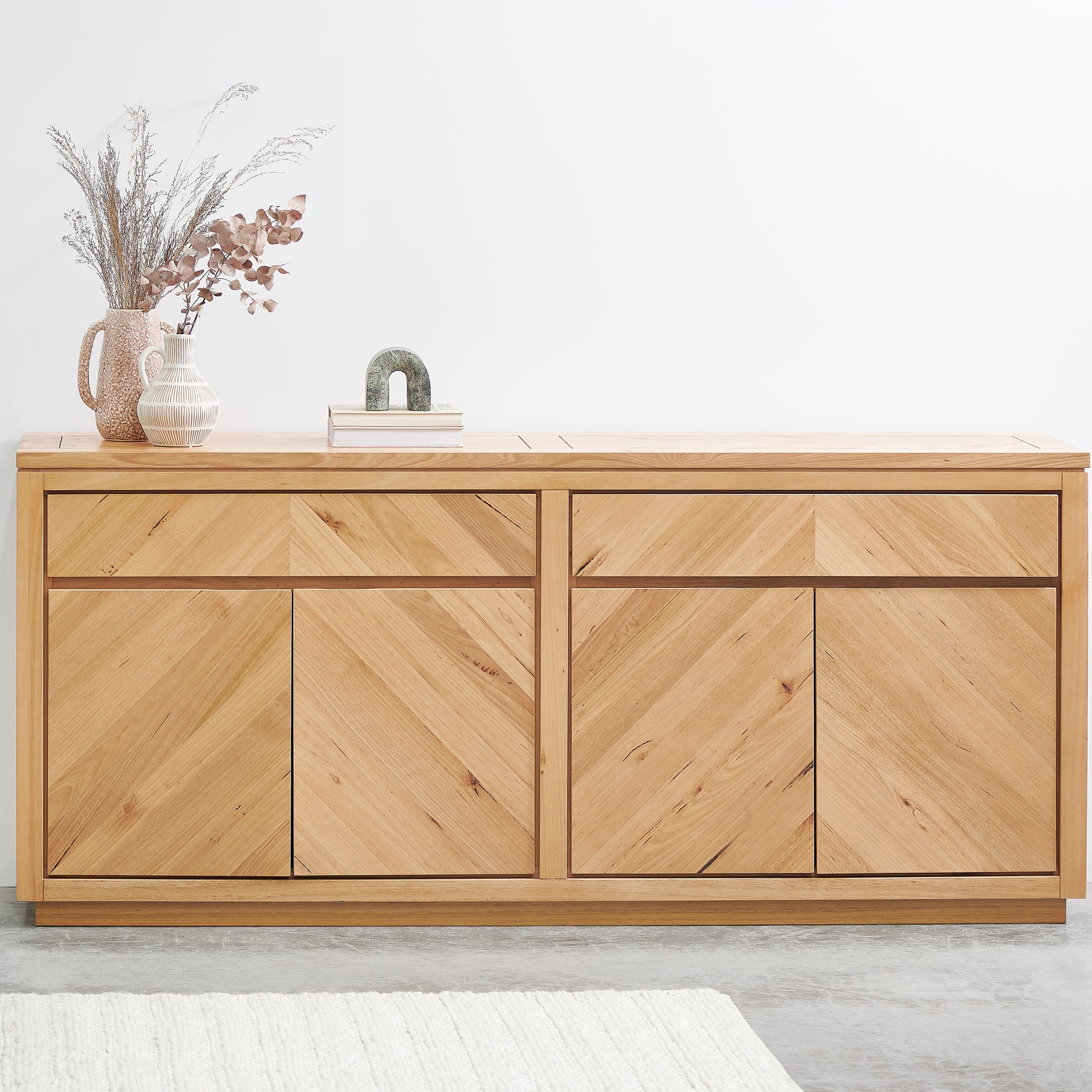 Introduce the functional and generous form of Tessa 2m Buffet Unit - Messmate into your living space and revel in its ample storage and display features. With its chevron patterning and cut-out design, you'll take pride in an elevated level of organisation. Check our huge range of natural buffet unit.