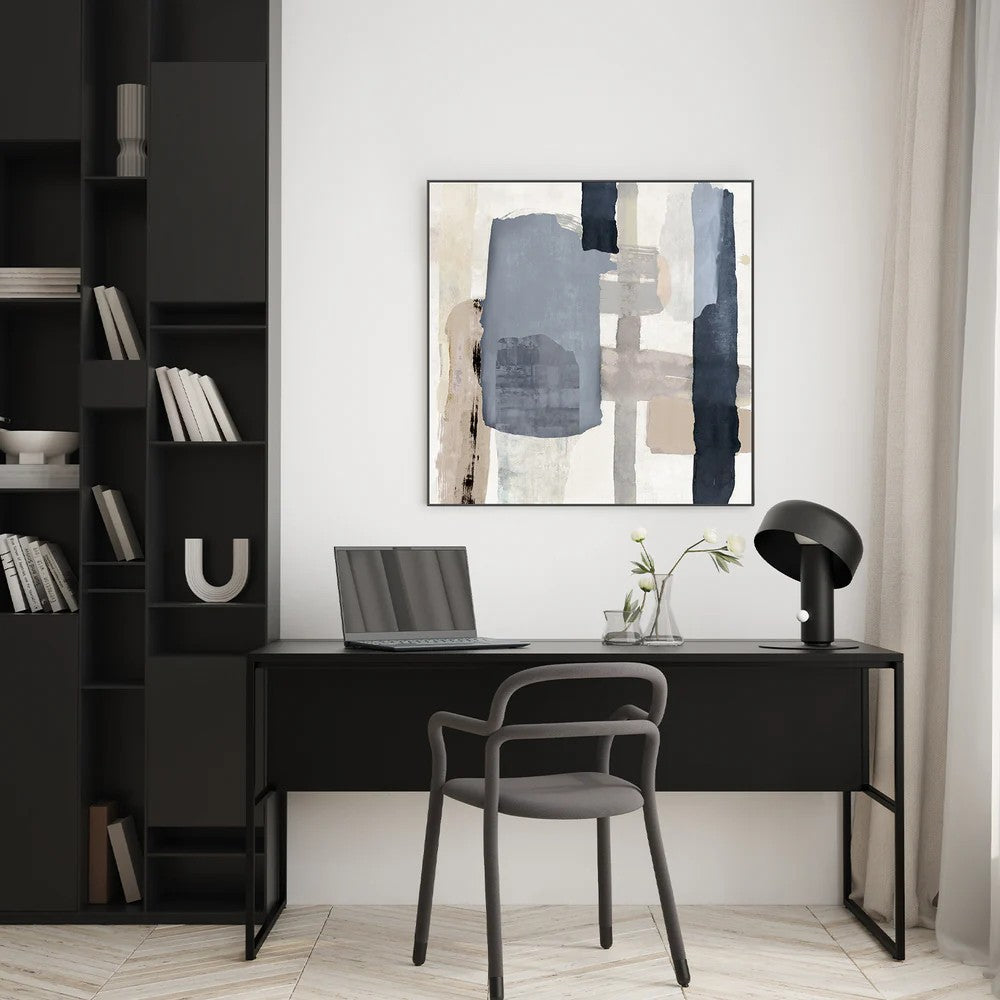 Layered abstract forms in soft neutrals and cool greys create a serene, modern aesthetic. Textured brushstrokes and balanced geometric shapes deliver refined contemporary style. Framed and ready to hang.
