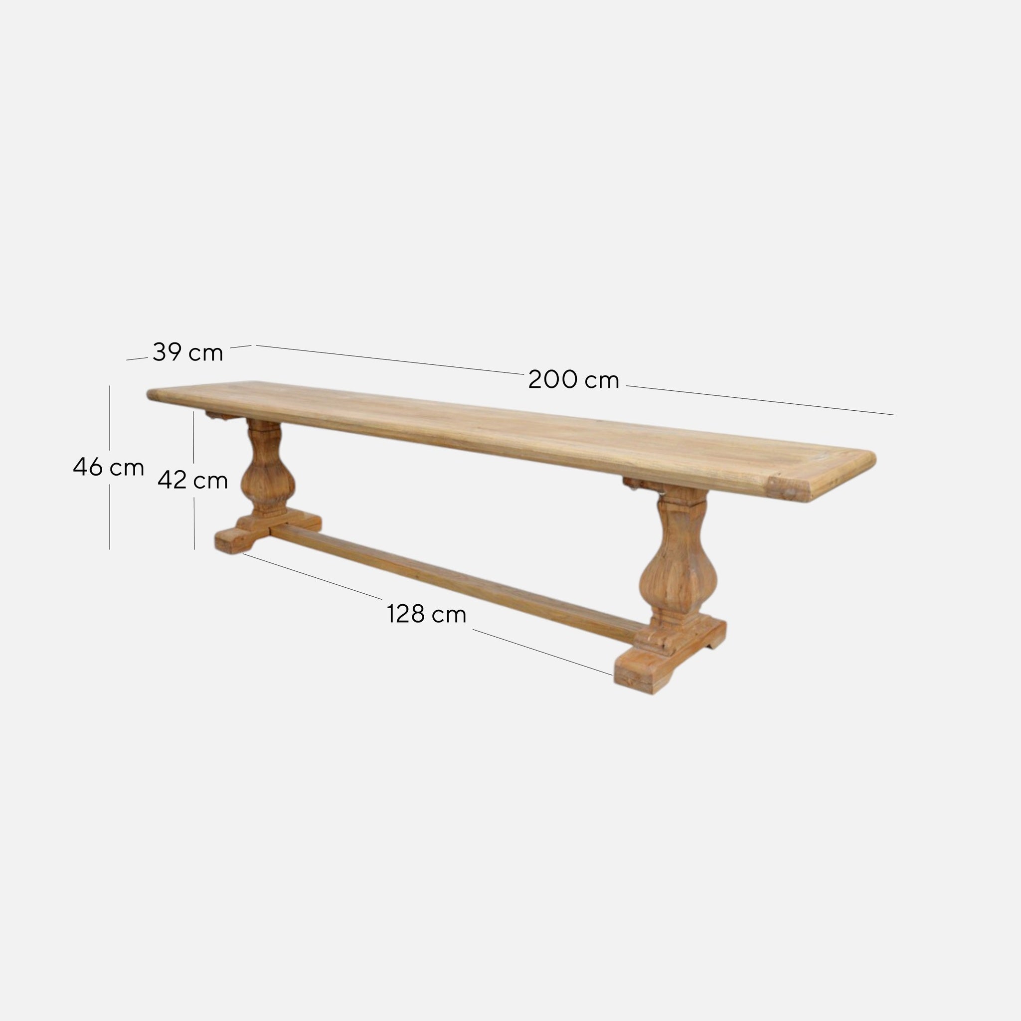 Overall: 200cm (W) x 39cm (D) x 46cm (H) Table Thickness: 4cm Table Hanging: 27cm Base: 9cm (W) x 42cm (H) Distance between Legs: 128-143cm