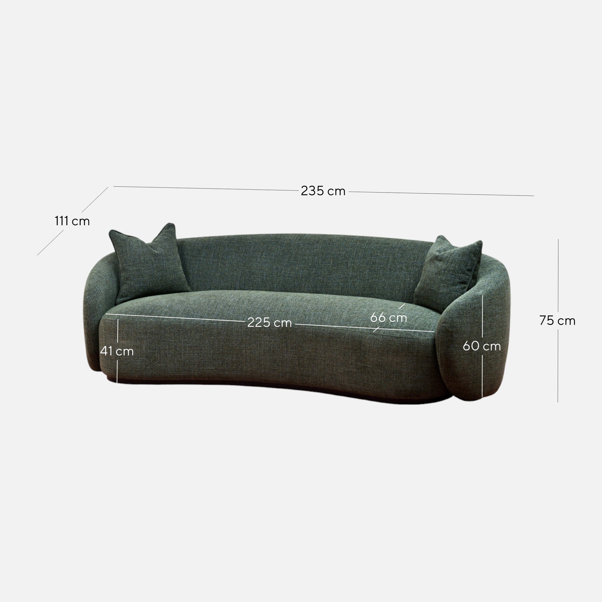 Overall: 235cm (W) x 111cm (D) x 75cm (H) Seat: 225cm (W) x 66cm (D) x 41cm (H) Arm Height: 60cm