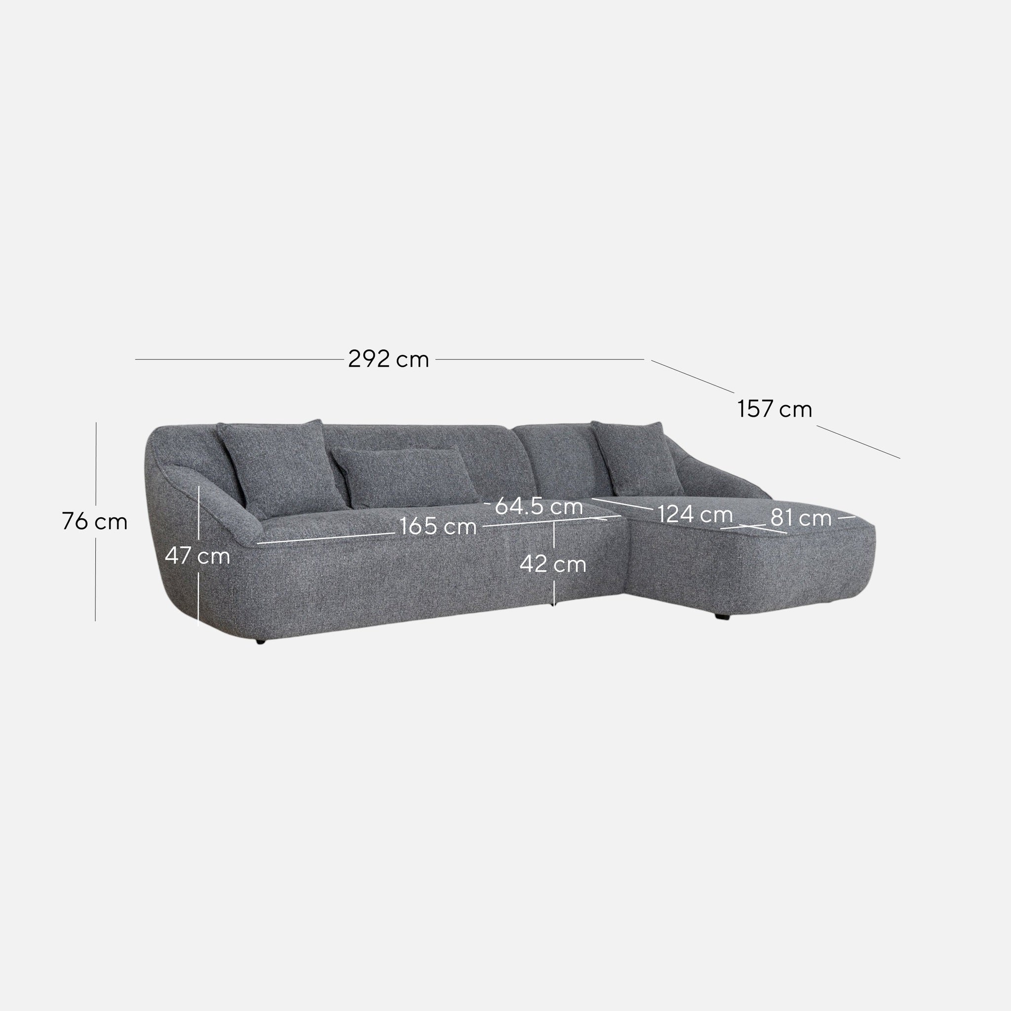 Overall: 292cm (W) x 157cm (D) x 76cm (H) Seat: 246cm (W) x 64.5-124cm (D) x 42cm (H) Sofa Seat: 165cm (W) x 64.5cm (D) x 42cm (H) Chase Seat: 81cm (W) x 124cm (D) x 42cm (H) Arm Height: 47cm Leg Height: 5cm