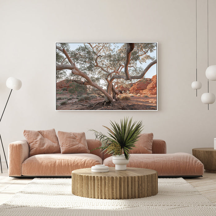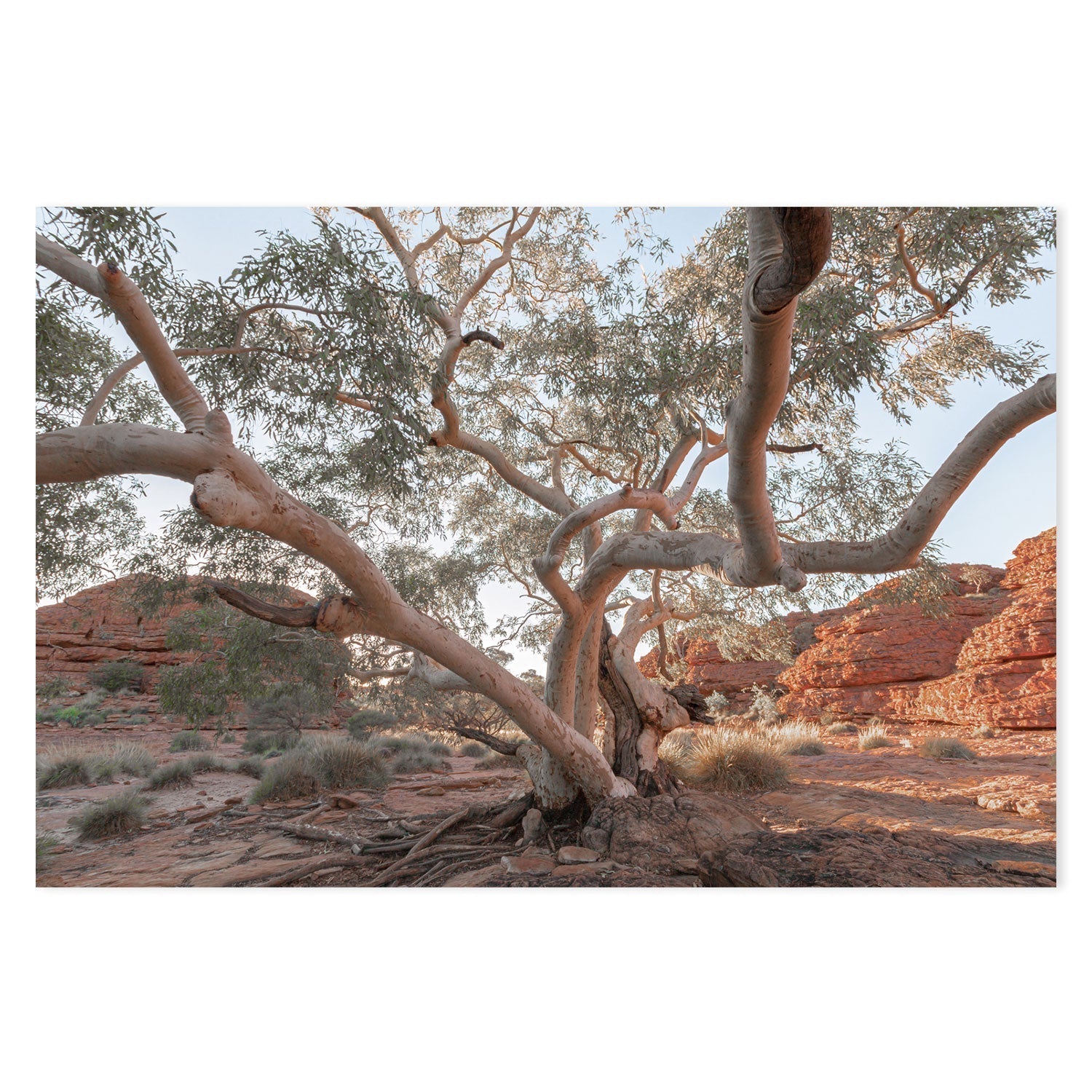 The Twisting Gum Tree is a vibrant and whimsical image, featuring a playful tree with dancing branches, evoking a sense of joy and wonder. Bring a touch of quirkiness and fun into your space with this delightful piece.