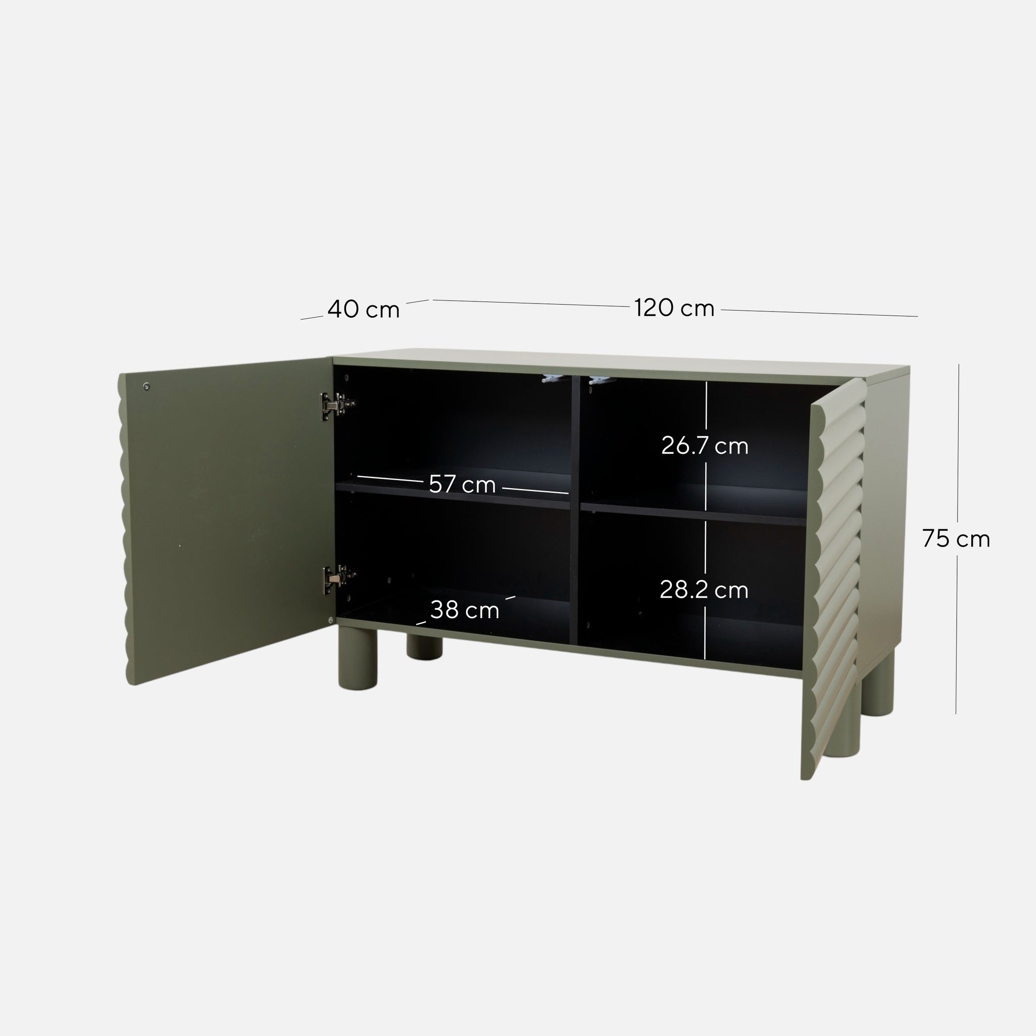 Balancing luxury and practicality, the Vasuda 1.2m Sideboard Unit offers ample storage within a sleek, refined silhouette. Its rich green finish brings a bold yet elegant touch, seamlessly complementing contemporary interiors as a stylish focal point.