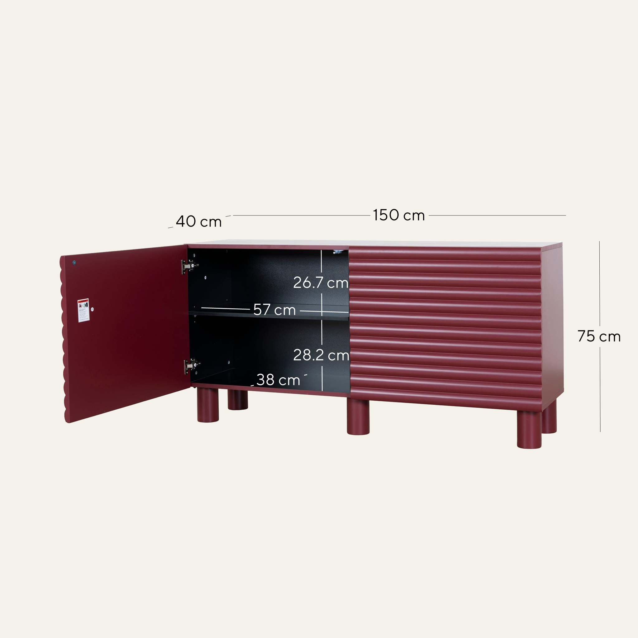 Overall: 150cm (W) x 40cm (D) x 75cm (H) Internal shelf (top): 57cm (W) x 38cm (D) x 26.7cm (H) Internal shelf (bottom): 57cm (W) x 38cm (D) x 28.2cm (H)