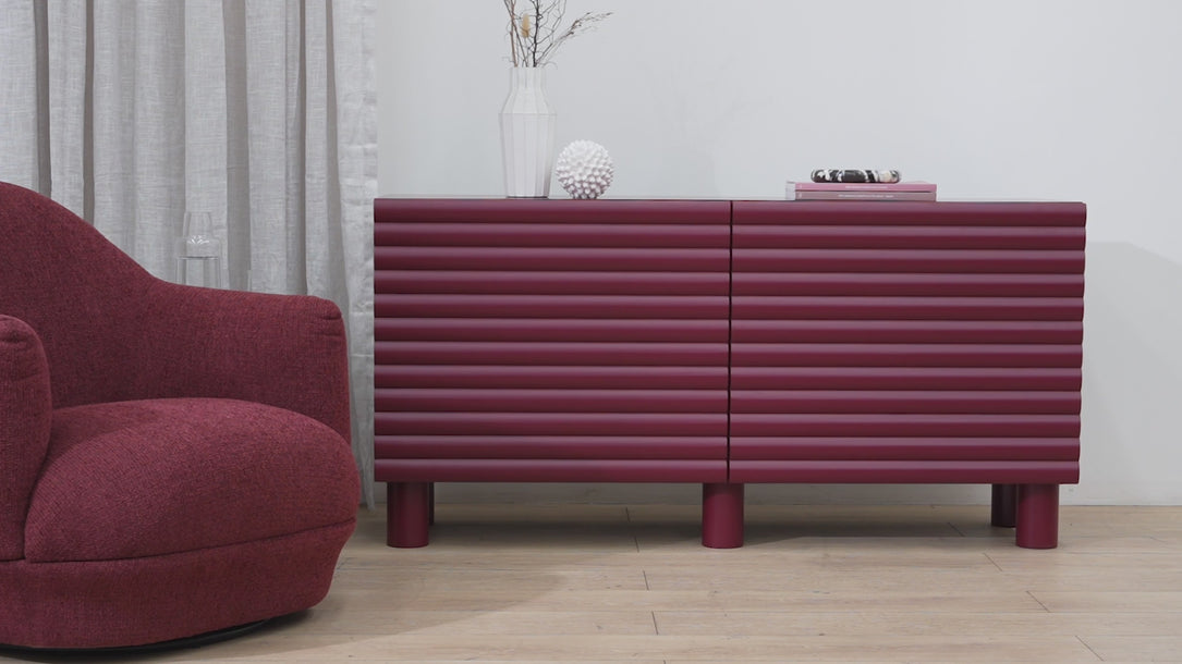 Crafted with precision, The Vasuda 1.5m Sideboard Unit in Red features dual swing doors revealing generous shelving for dinnerware, linens, or daily essentials. Its smooth matte finish and sculptural lines showcase refined craftsmanship and architectural charm.