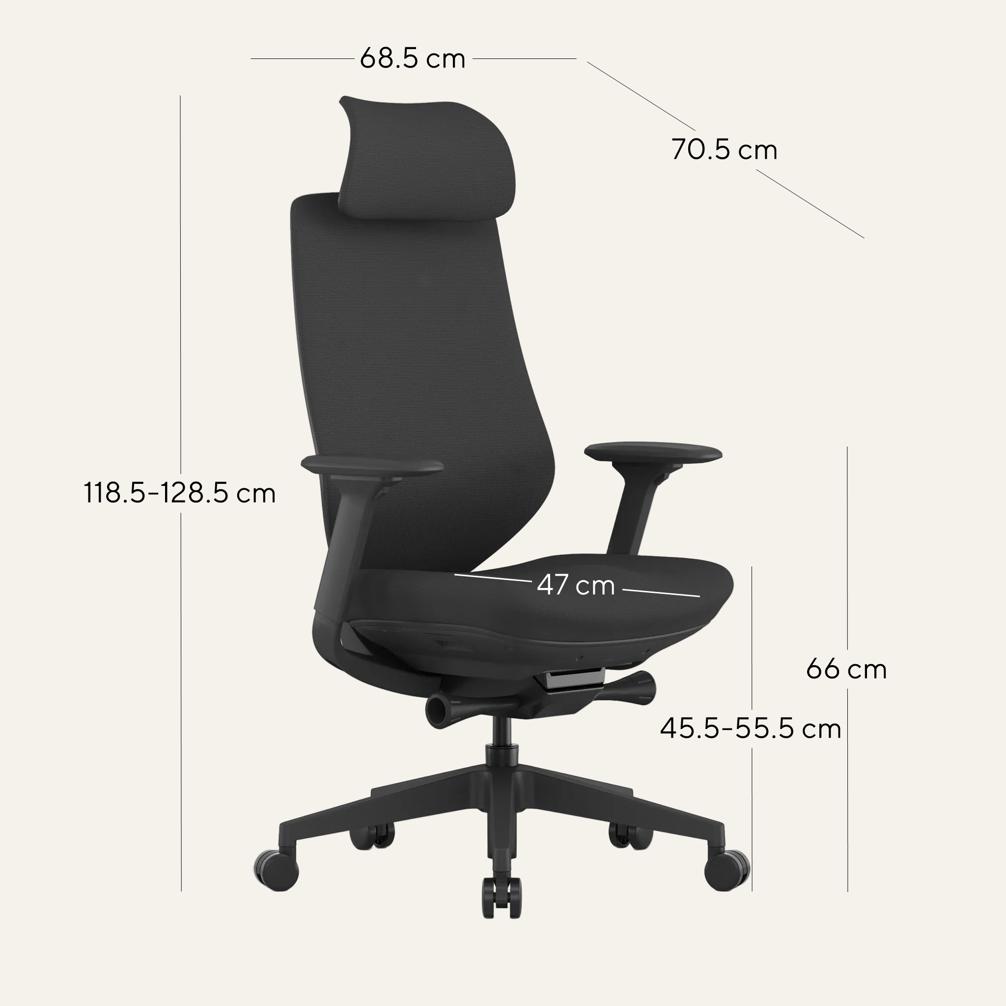 Overall: 68.5cm (W) x 70.5cm (D) x 118.5-128.5cm (H) Seat: 47.5cm (W) x 47cm (D) x 45.5-55.5cm (H) Arm Height: 66cm