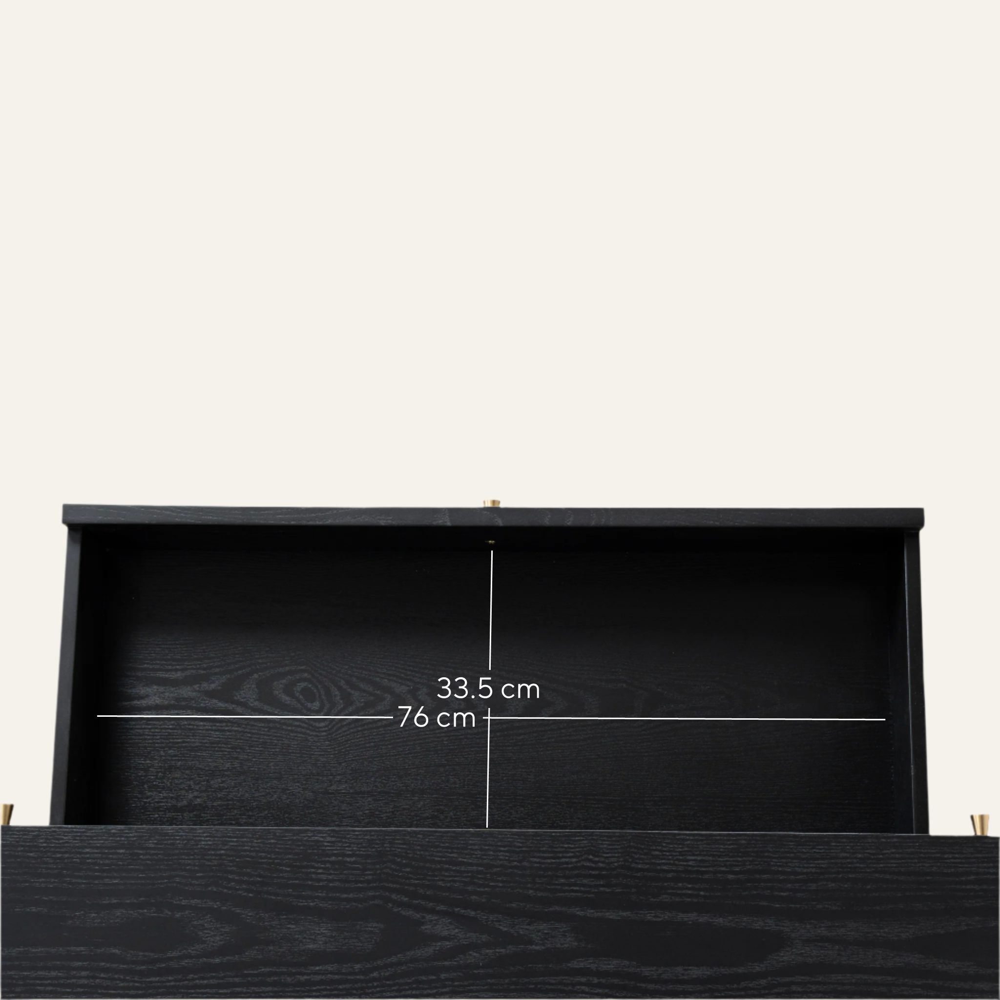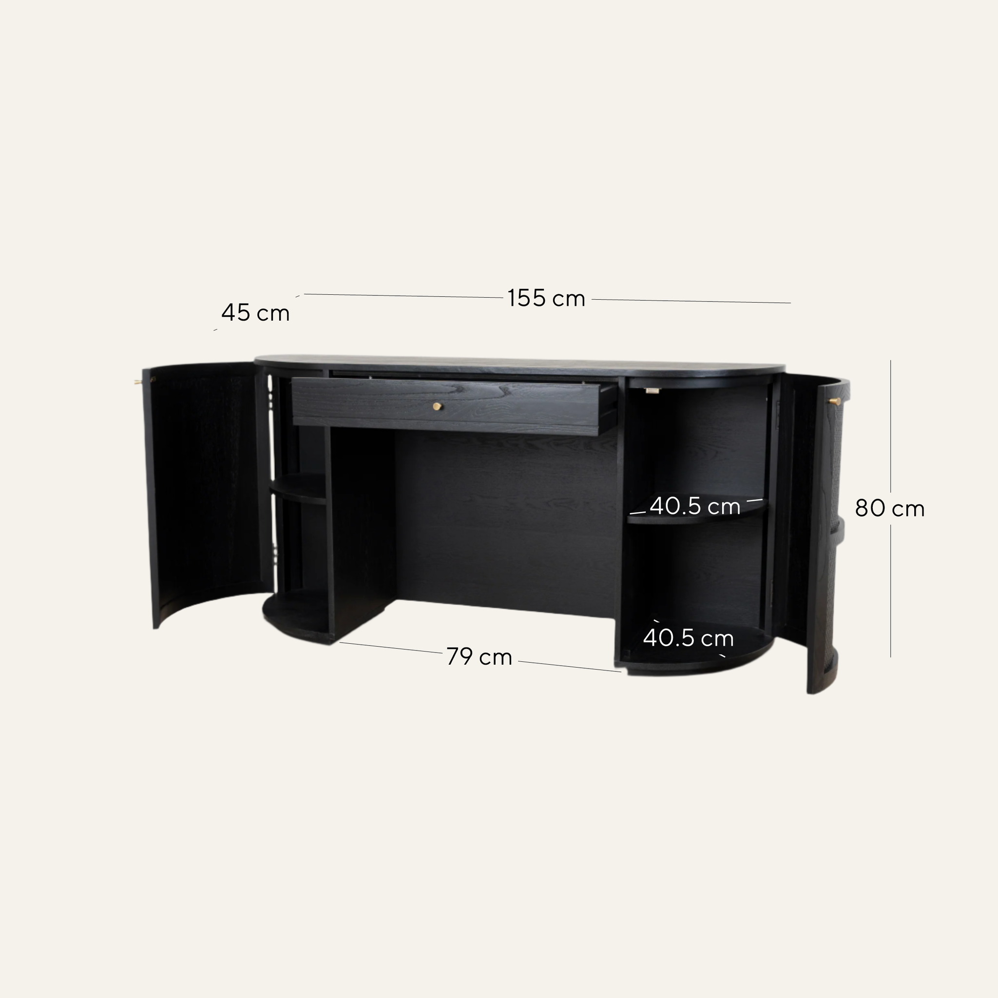 Overall: 155cm (W) x 45cm (D) x 80cm (H) Internal Drawer: 76cm (W) x 33.5cm (D) x 9.5cm (H) Each shelf: 40.5cm (W) x 40.5cm (D) x 30.25cm (H) Distance between Legs: 79cm