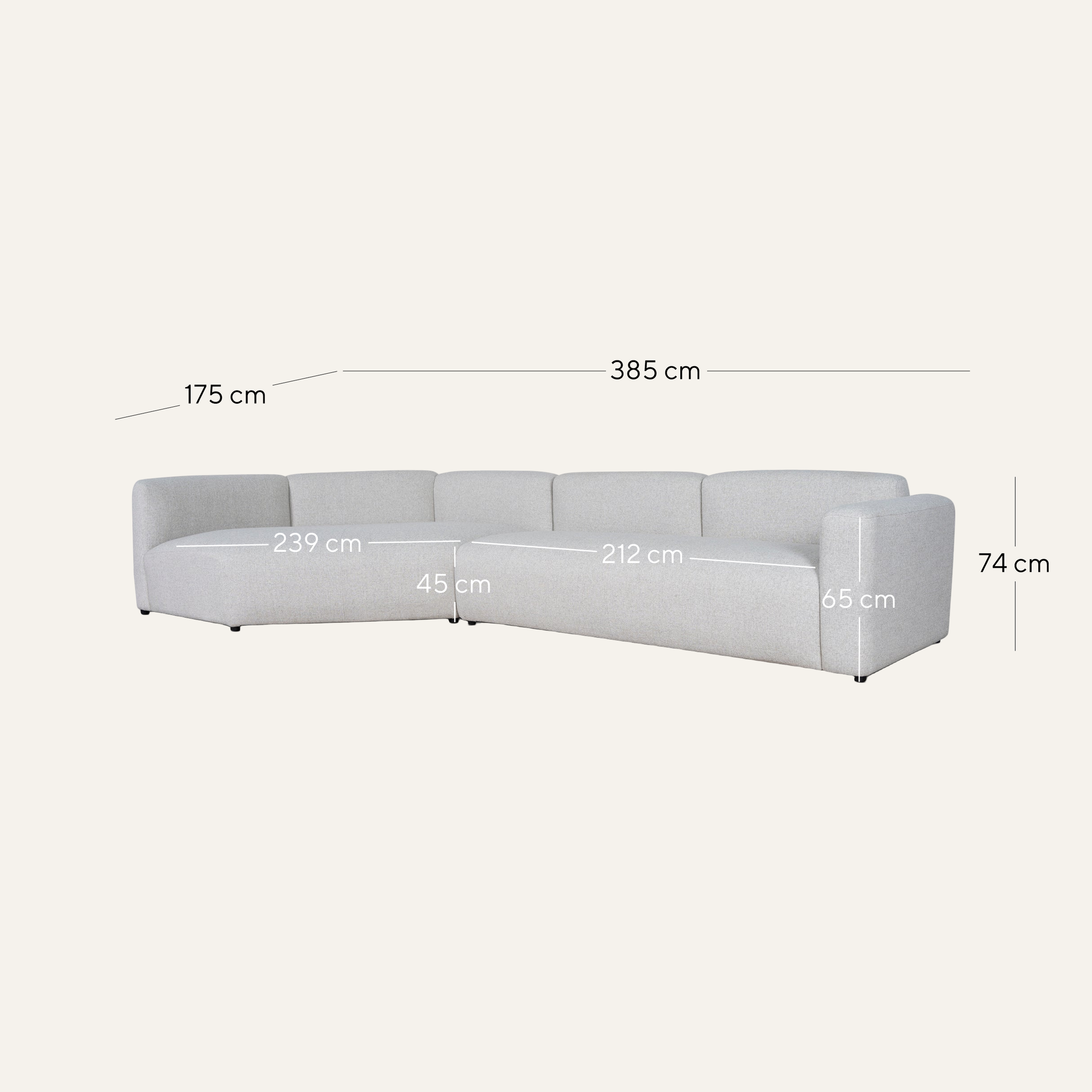 Overall: 385cm (W) x 175cm (D) x 74cm (H) Seat: 302cm (W) x 77cm (D) x 45cm (H) Left Arm Sofa: 212cm (W) x 100cm (D) x 74cm (H) Corner: 239cm (W) x 141cm (D) x 74cm (H) Arm Height: 65cm Leg Height: 3cm