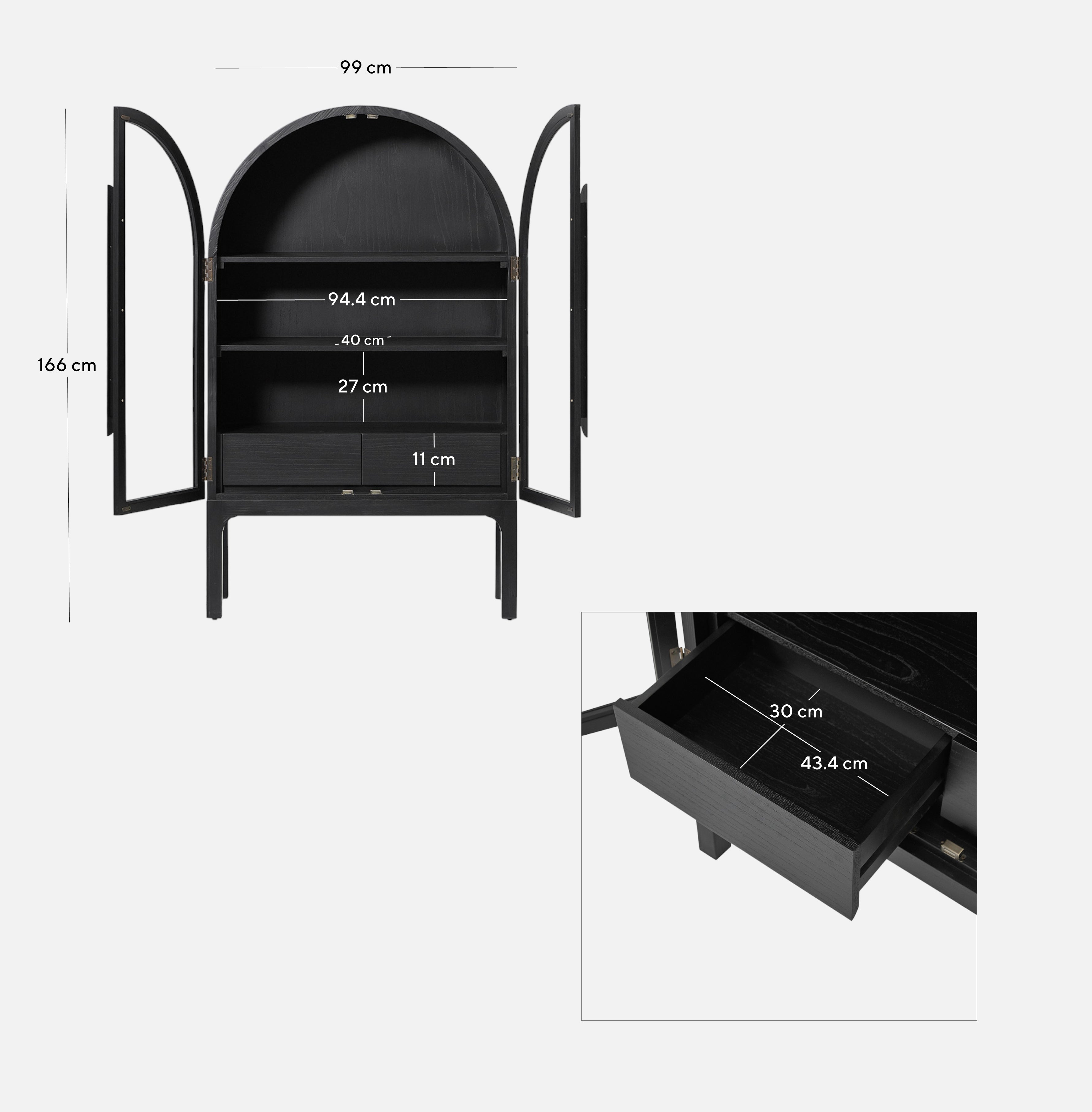 Overall: 99cm (W) x 47cm (D) x 166cm (H) Shelf: 94.4cm (W) x 40cm (D) x 27cm (H) Drawers: 43.4cm (W) x 30cm (D) x 11cm (H)