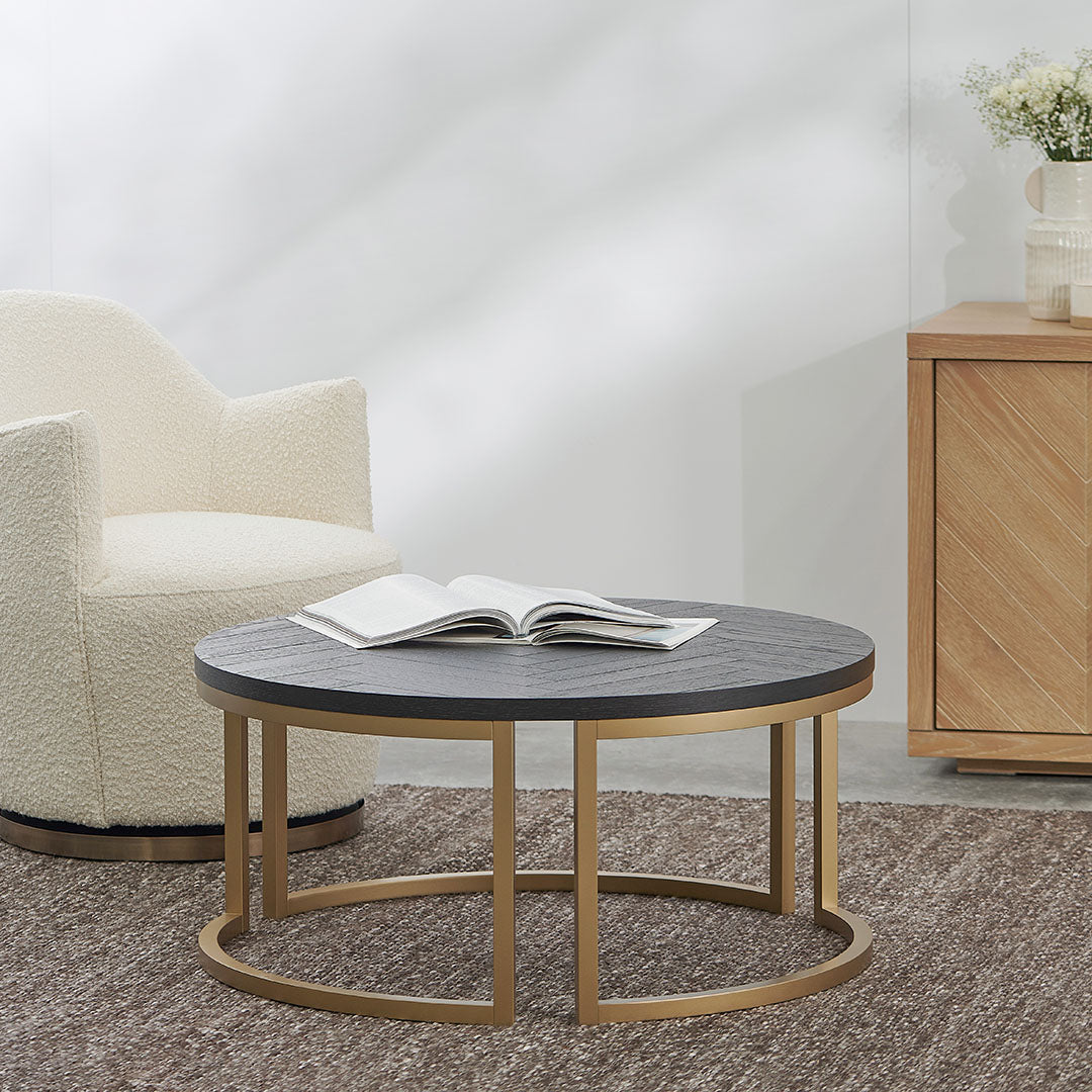 Bring natural class into your lounging experience with Wilma Round Coffee Table - Peppercorn and its luxurious details. Boasting a brushed brass base, herringbone table top and a sophisticated silhouette - the Wilma will imbue your space with a designer ambience. Our round coffee table boasts a harmonious blend of timeless design and modern functionality, making it a captivating centerpiece that encourages gatherings and adds a touch of graceful style to your living space. You can check our range of round coffee table here.