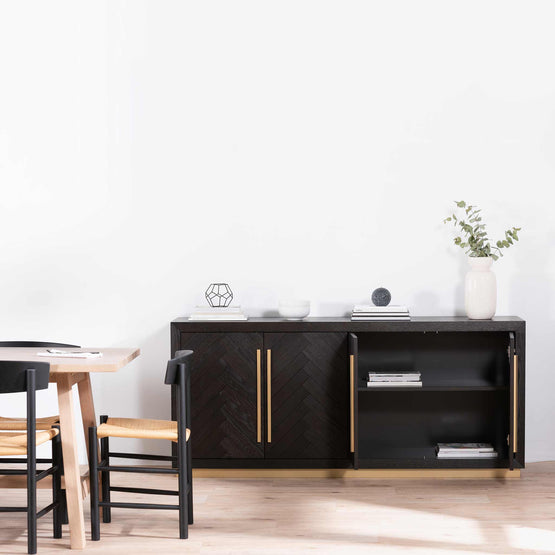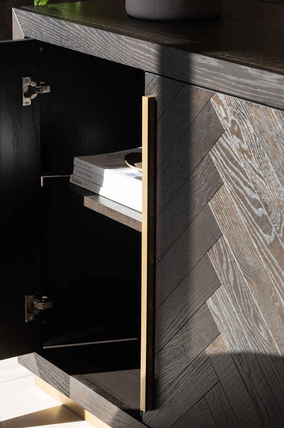 The Wilma 180cm Sideboard in Peppercorn and Brass blends rich black tones with subtle brass accents for a touch of contemporary elegance. Thoughtfully designed, it transforms empty spaces into functional showcases with ample storage and standout style.