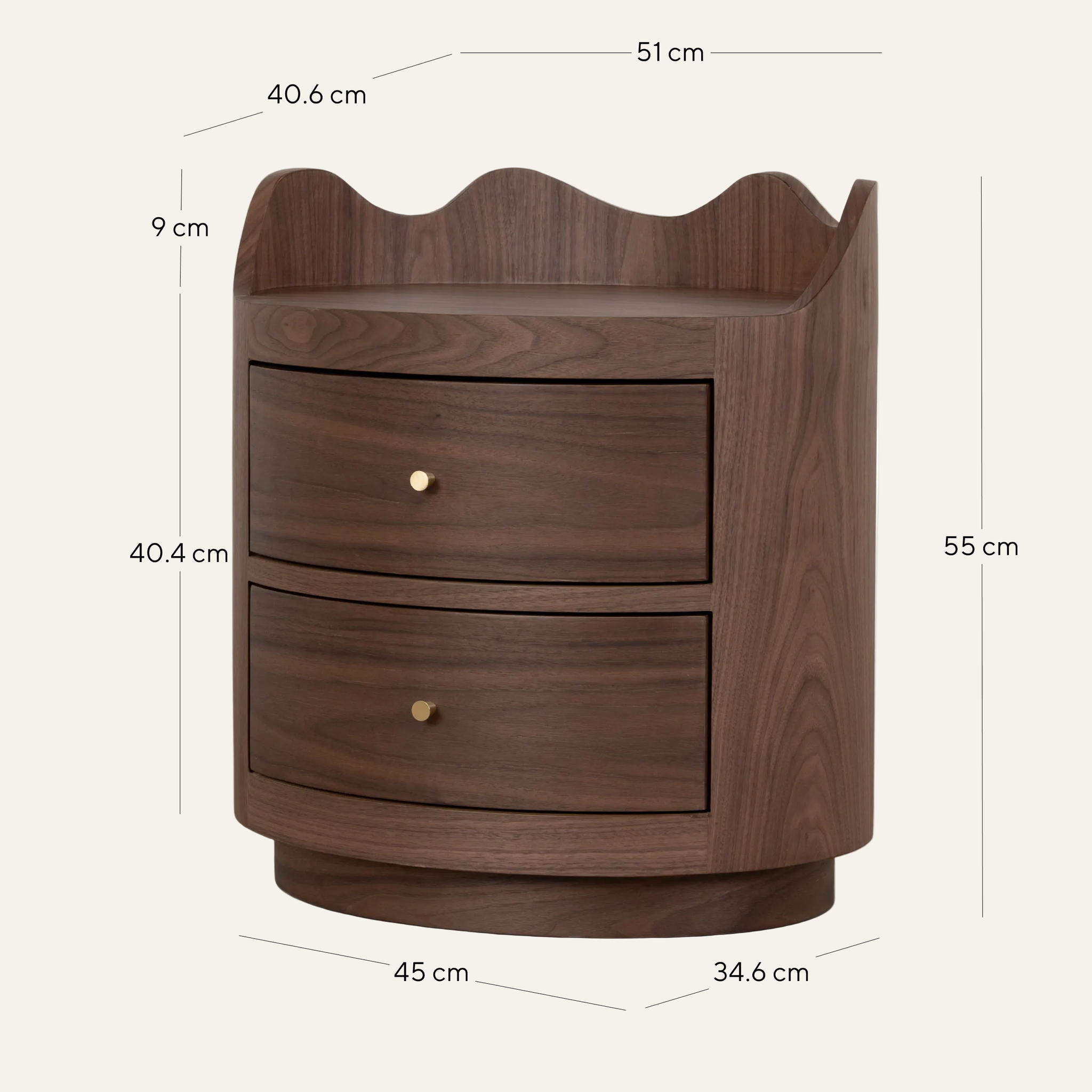 Bringing a playful yet refined presence to the bedroom, The Wina 51cm Bedside Table in Walnut features a softly curved silhouette and rich walnut tone. Its sculptural form adds warmth and character, creating a design-forward accent that stands out without overwhelming the space.