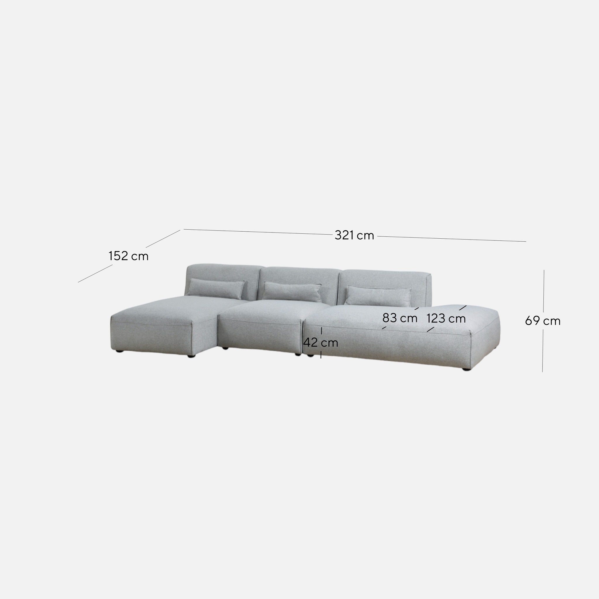 Overall: 321cm (W) x 152cm (D) x 69cm (H) Seat: 321cm (W) x 83/123cm (D) x 42cm (H) Leg Height: 5cm