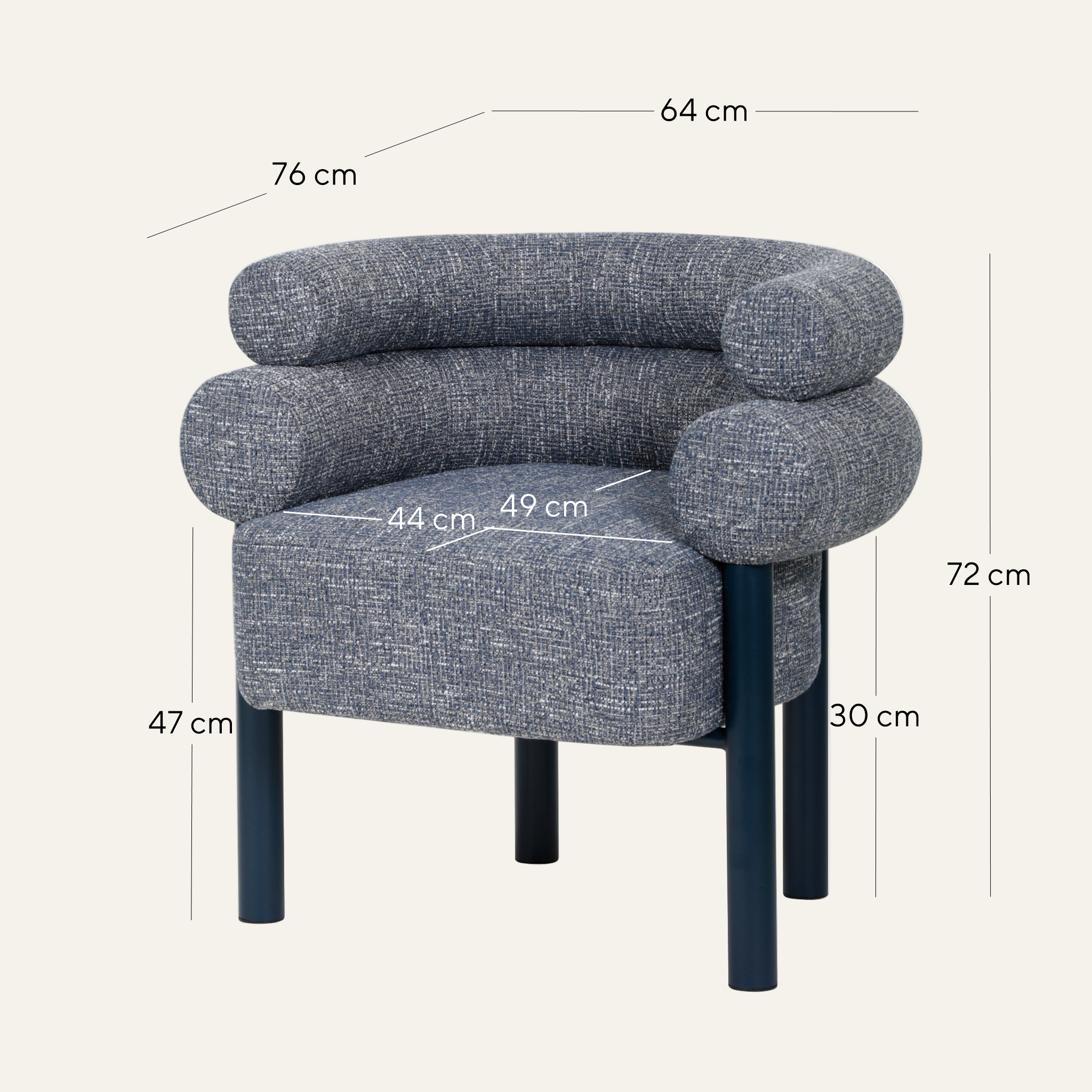 The Yara Navy Armchair in Prussian Blue pairs a modern aesthetic with a playful sculptural twist. Its layered backrest and rounded silhouette add depth and texture to any space.