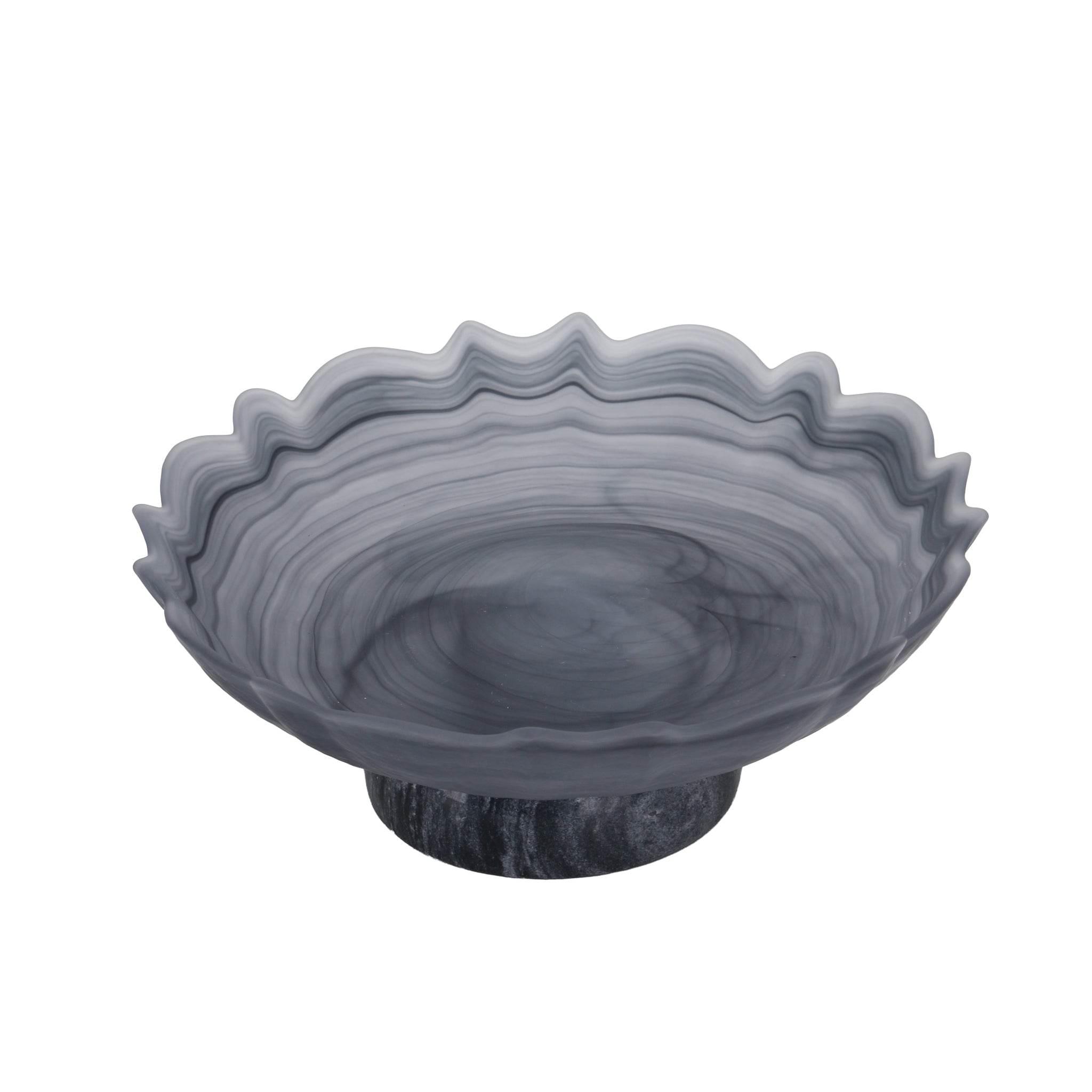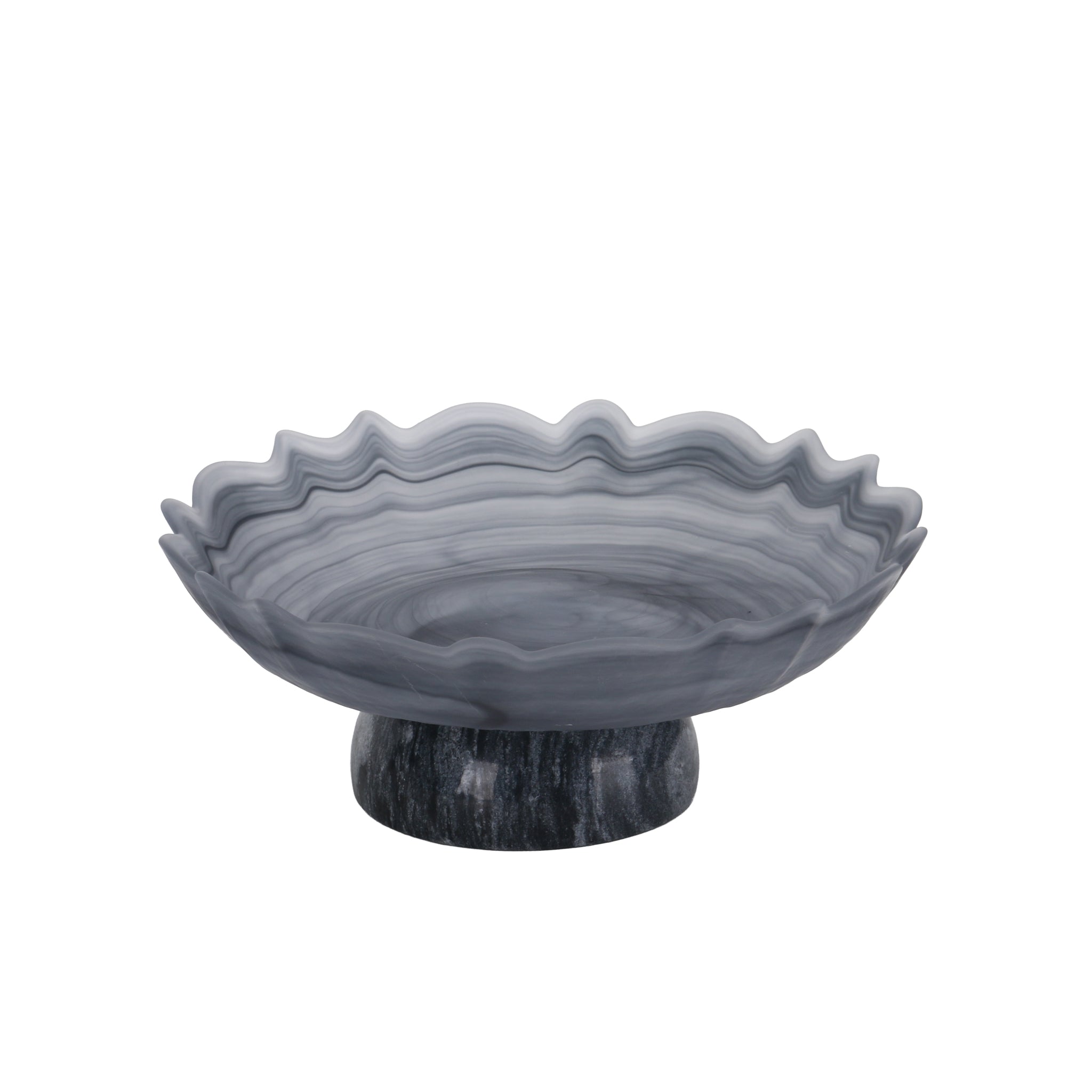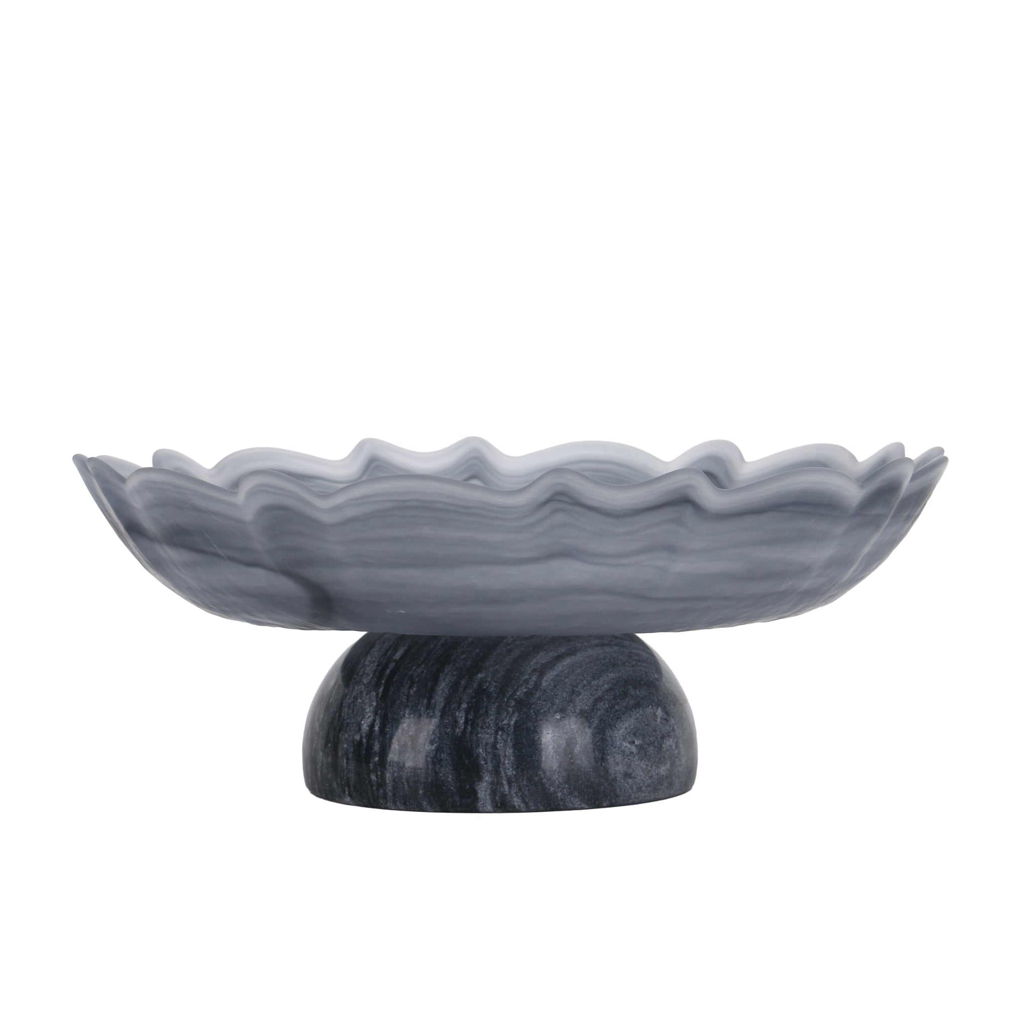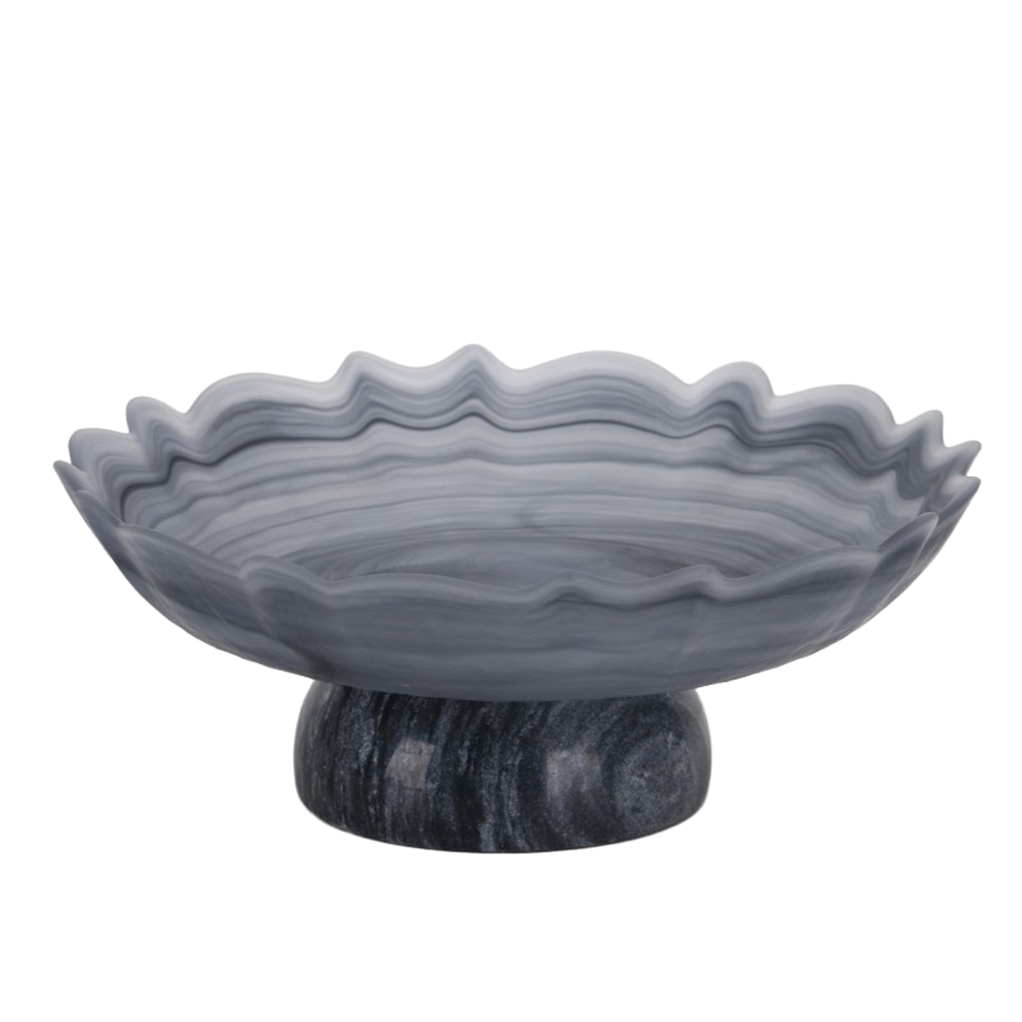 Perched on a rounded pedestal base, the Zavora Lotus Glass Tray in Grey has a graceful lift that adds dimension and makes whatever you place upon it feel curated and intentional. The smooth, substantial glass catches light beautifully subtle highlights play across the surface and accentuate the petal edges.