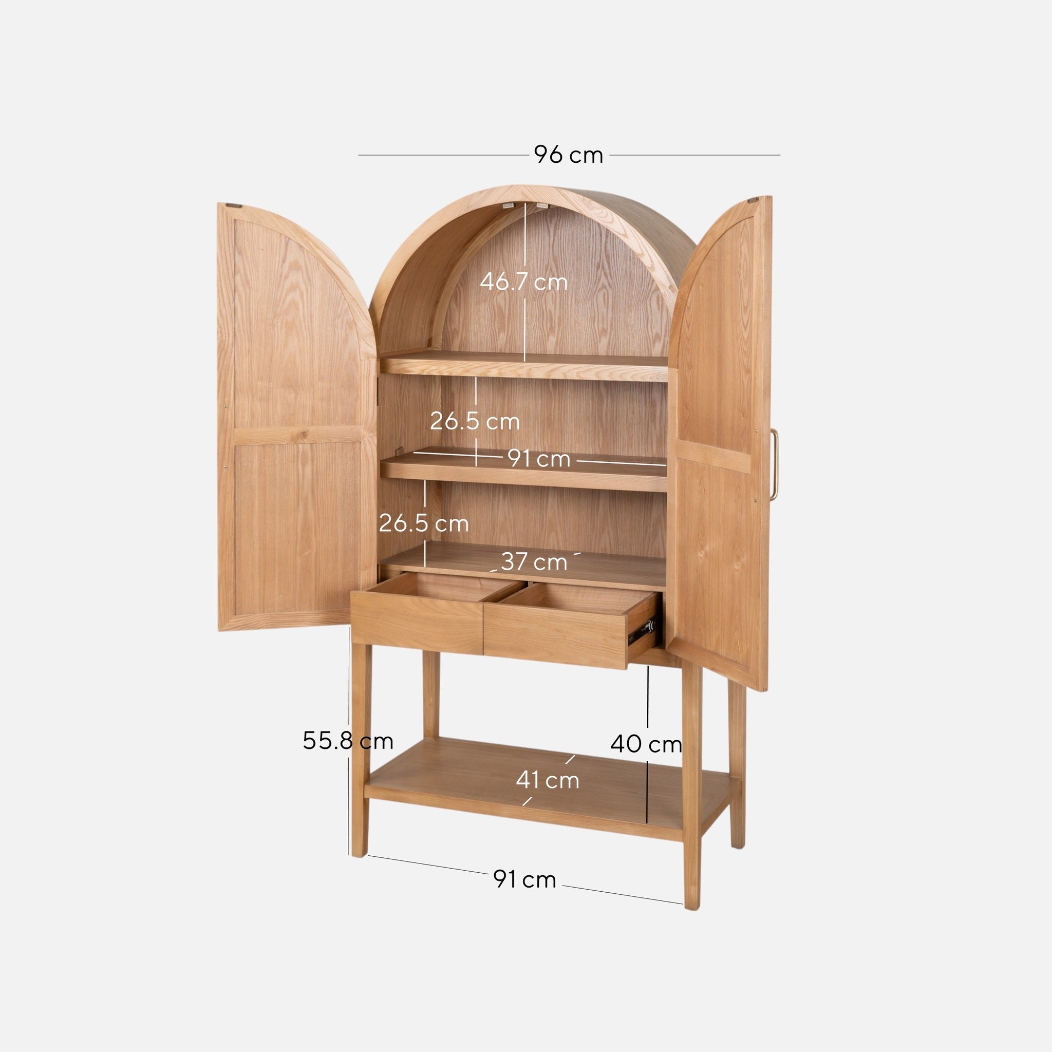 Overall: 96cm (W) x 48cm (D) x 183cm (H) Base Self: 91cm (W) x 41cm (D) x 40cm (H) Top Shelf: 91cm (W) x 37cm (D) x 46.7cm (H) Other Shelves: 91cm (W) x 37cm (D) x 26.5cm (H) Leg Height: 55.8cm Distance between Legs: 91cm